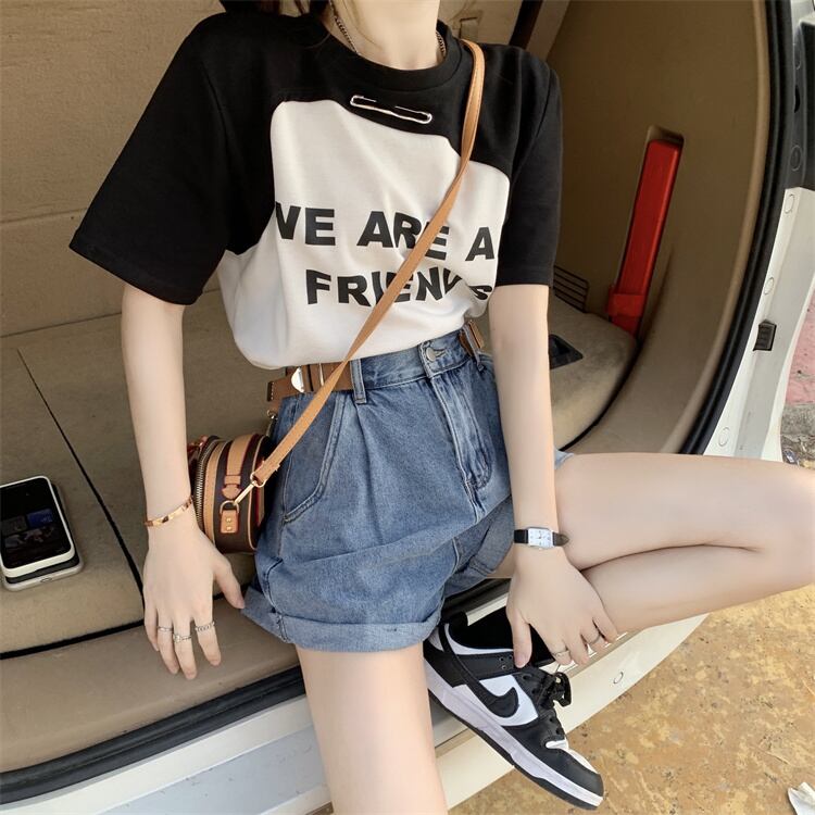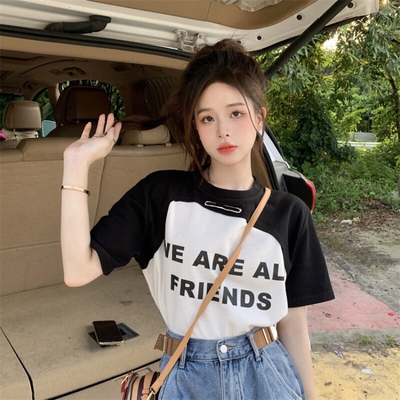 sense contrast color fake two-piece short-sleeved t-shirt women's summer 2022 new version letter printing loose shirt tide サマー 夏物 Tシャツ 0921994355529075