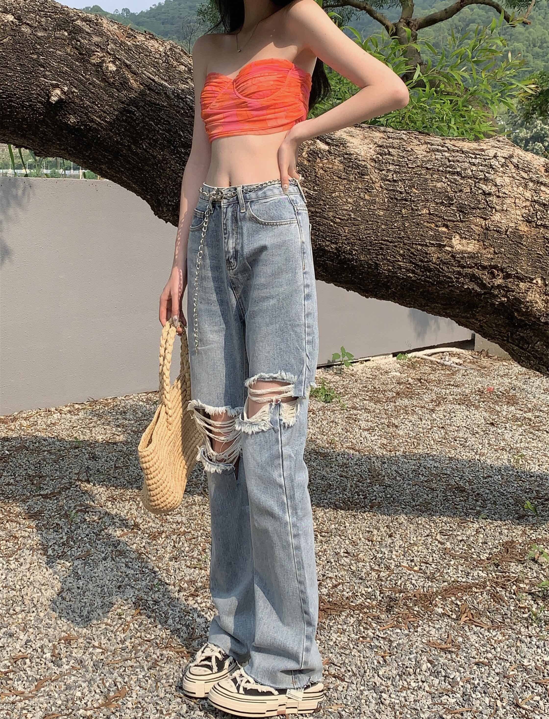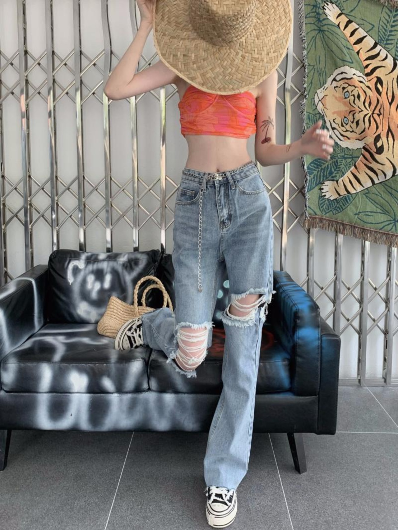 sense chic hole washed high waist jeans women's summer 2022 new version slim straight pants ハイウェスト サマー 夏物 スリム 0921945040110056