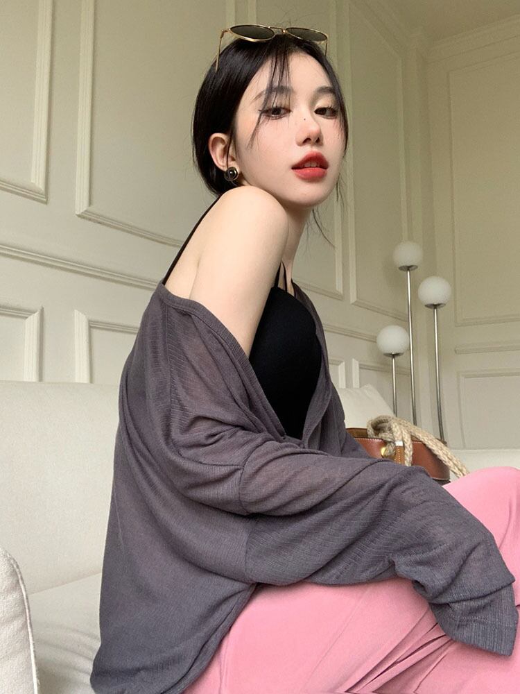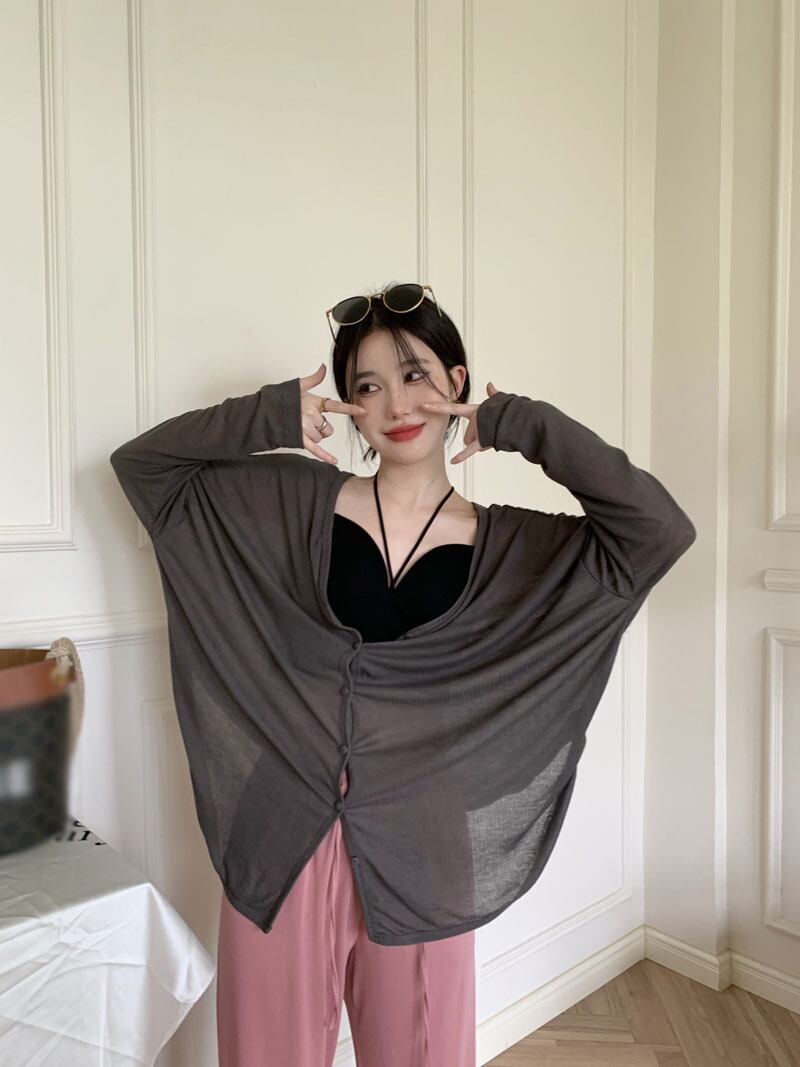 Gray sunscreen cardigan knitted jacket women's summer 2022 new net red v-neck loose mid-length long-sleeved top ロング レッド カーディガン サマー 夏物 Vネック 0921958228331795
