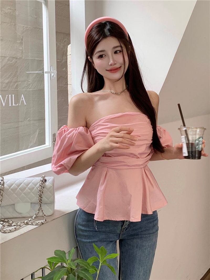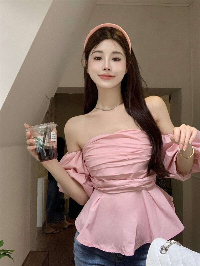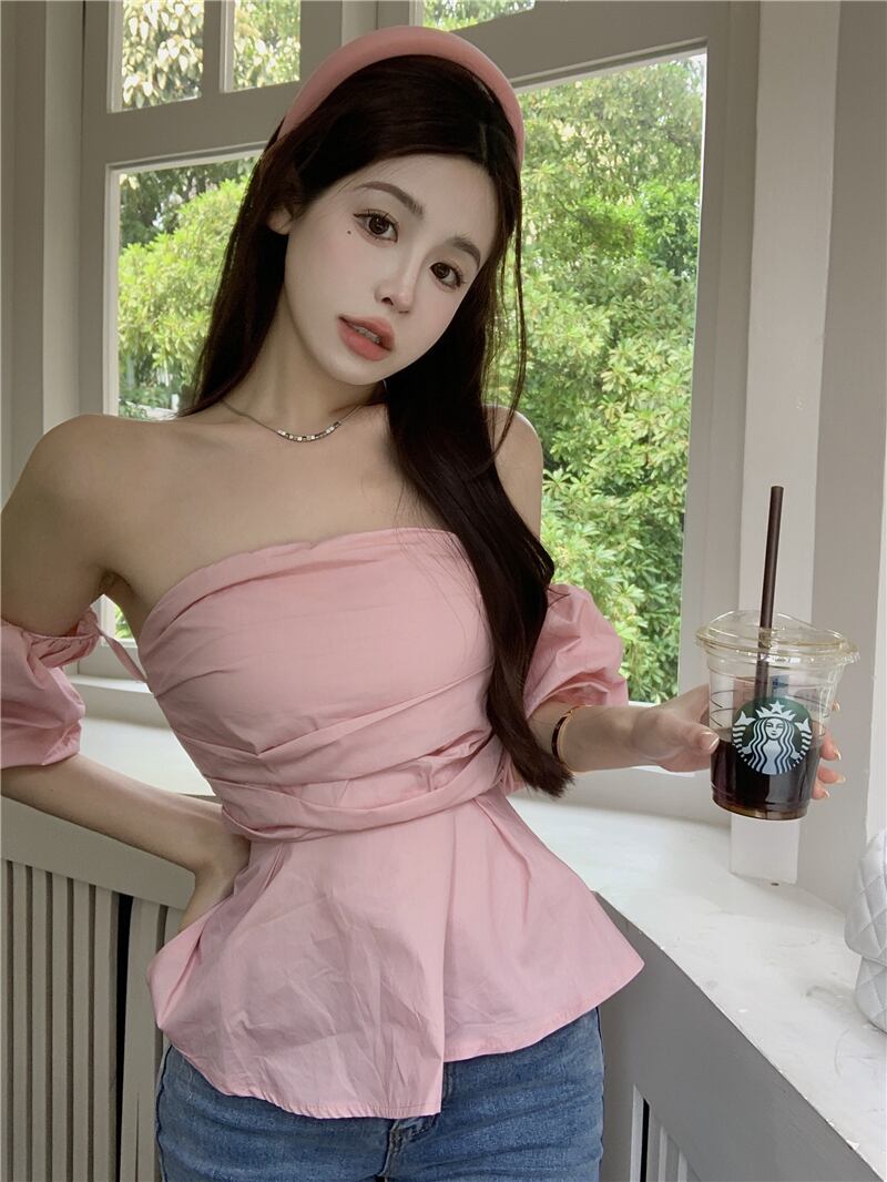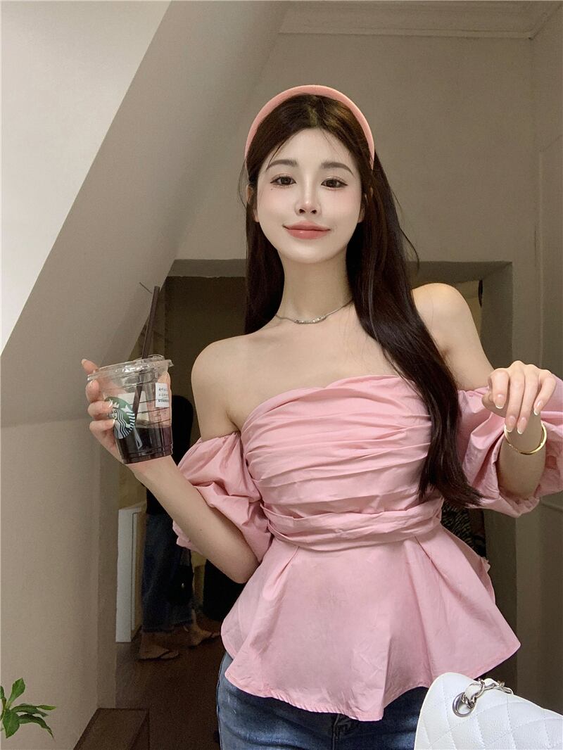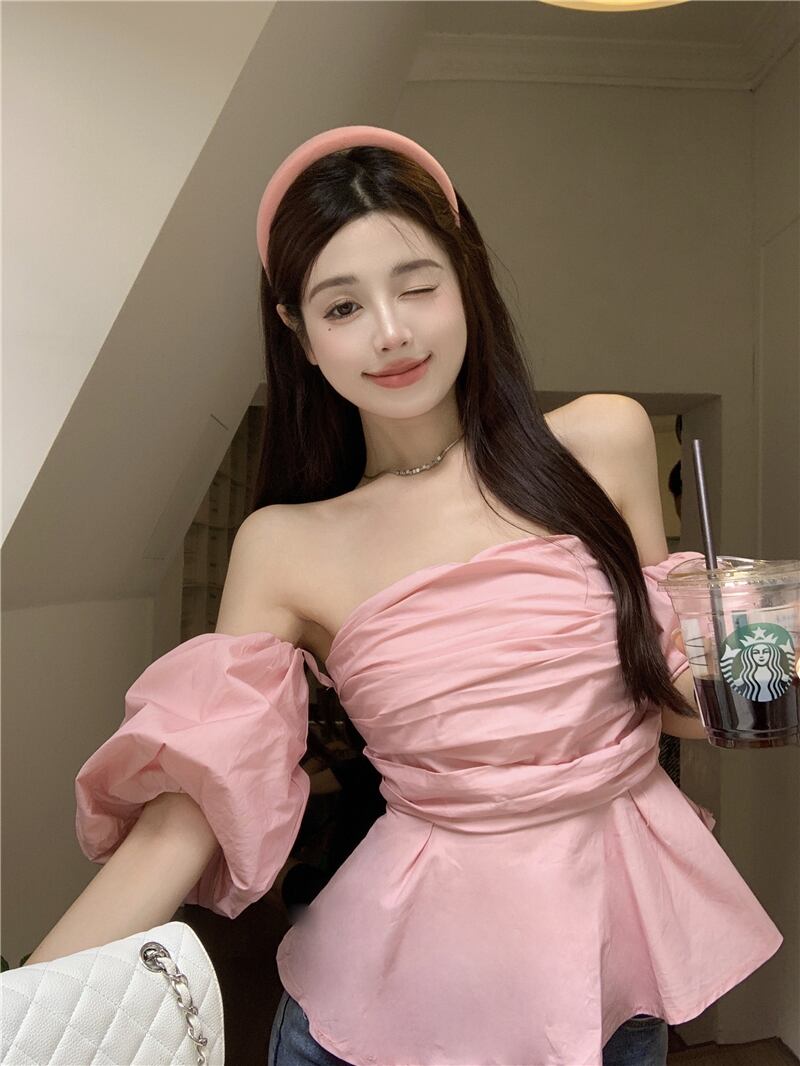 Sweet and spicy pink one-shoulder short top women's summer 2022 new net red pleated waist puff sleeve shirt ショート ピンク レッド 大人ガーリー スウィート キュート カジュアル プリーツ サマー 夏物 0921993606244707