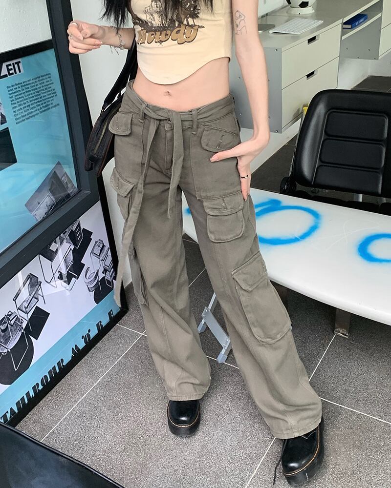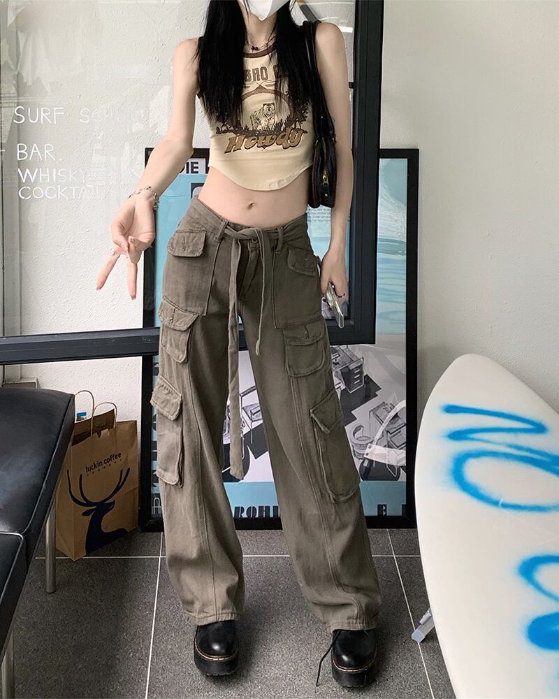 Retro wide-leg jeans women's summer 2022 new design sense lace-up multi-pocket high-waisted slim overalls pants レトロ レース サマー 夏物 スリム レースアップ ポケット多め マルチポケット 0921998209390099