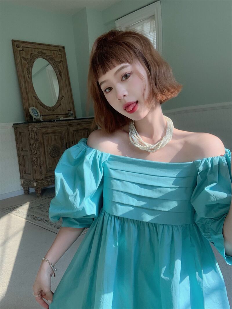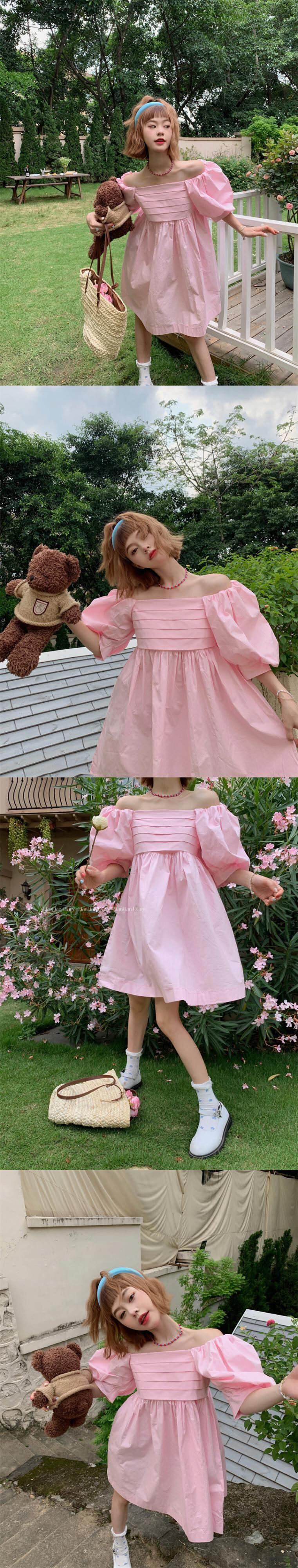 Sweet pink puff sleeve one-shoulder dress women's summer 2022 new pleated waist small A-line skirt ピンク 大人ガーリー スウィート キュート カジュアル プリーツ サマー 夏物 スカート Aライン 092199927617348