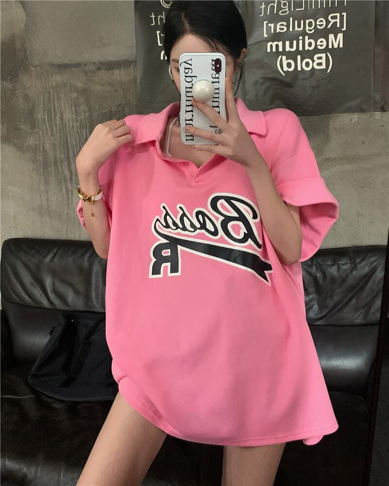 Pink letter polo collar loose t-shirt women's summer 2022 new bottom shirt missing mid-length half-sleeve top trendy ピンク サマー 夏物 Tシャツ 0921922489348794
