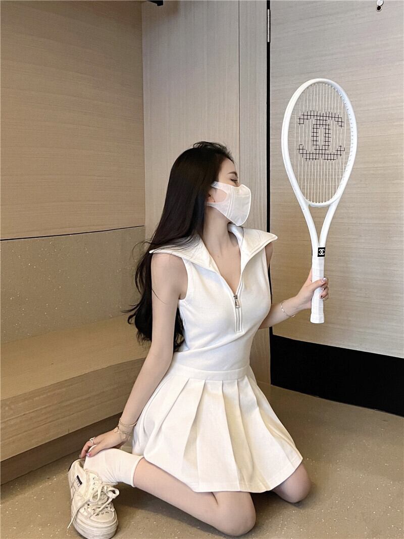 Pure desire white polo collar sleeveless dress women's summer 2022 new design temperament waist pleated skirt ホワイト プリーツ サマー 夏物 ノースリーブ スカート 0921922397381890