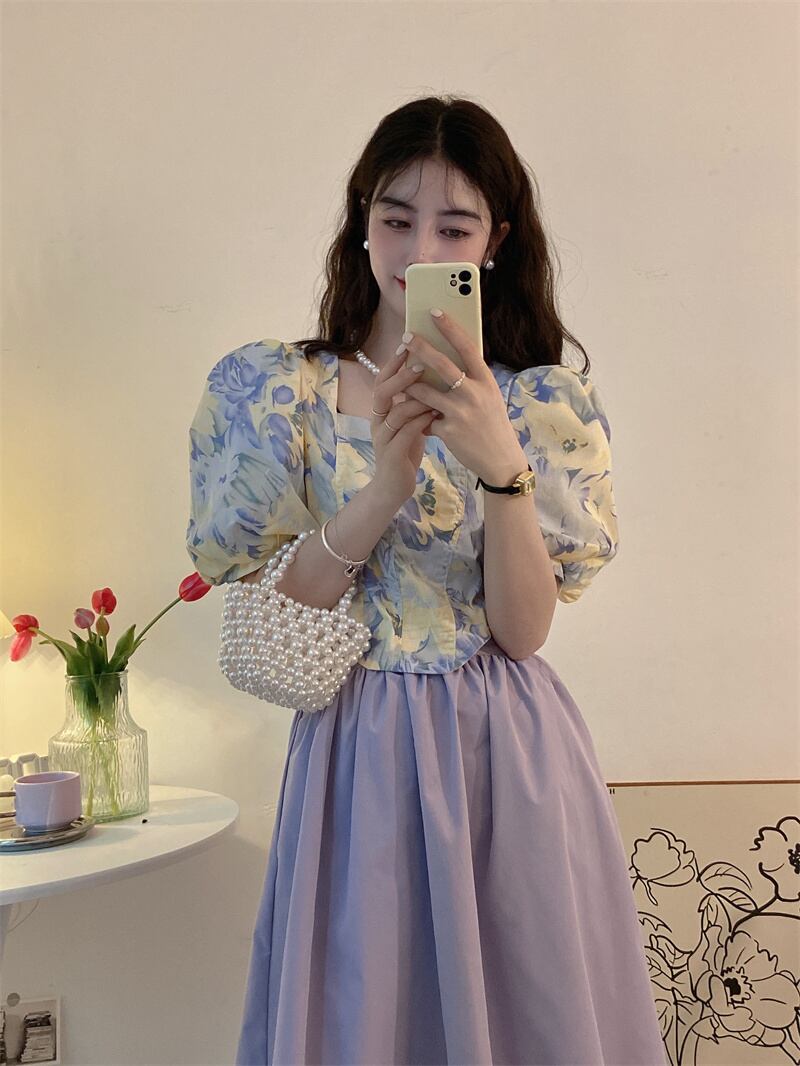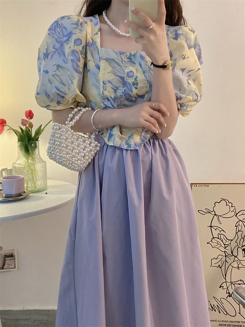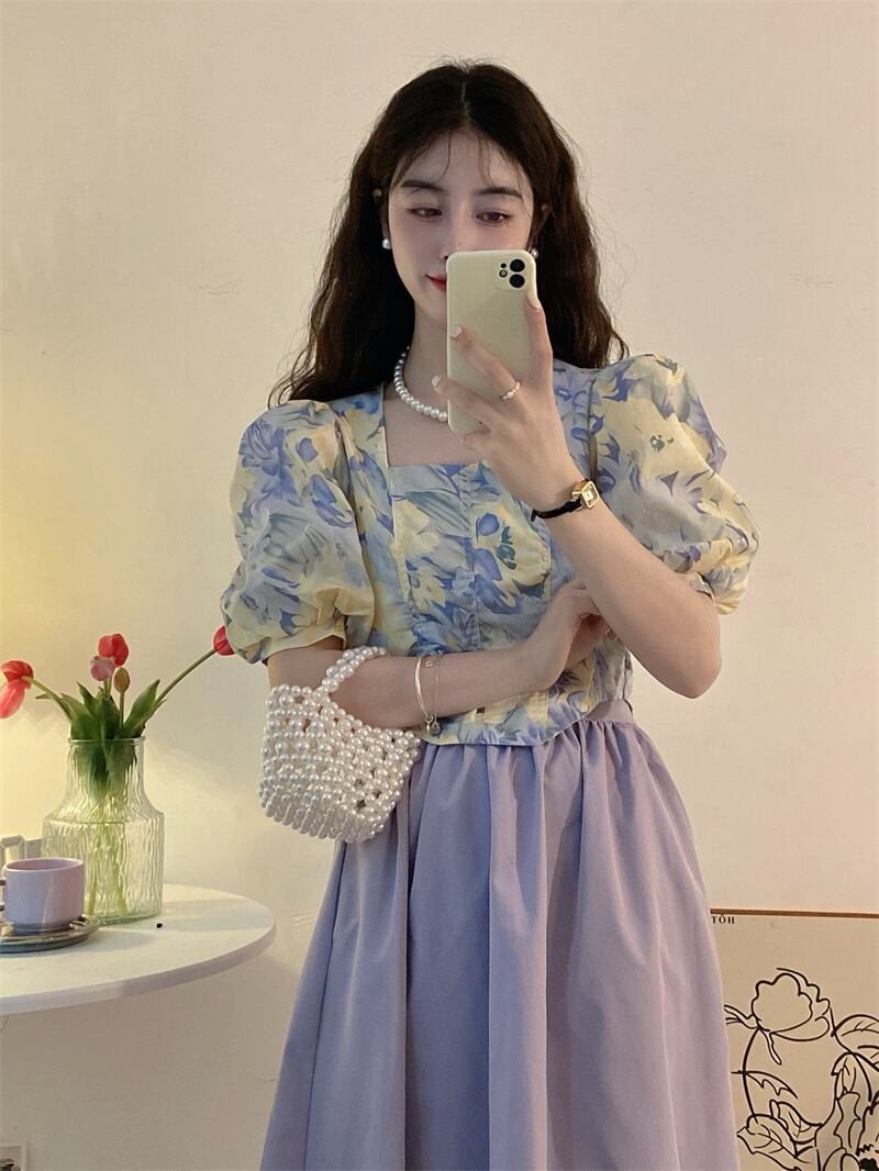 Gentle wind sweet puff sleeve floral shirt women's summer 2022 new temperament square collar irregular short top ショート 大人ガーリー スウィート キュート カジュアル サマー 夏物 花柄 スクウェア 0921937394628151