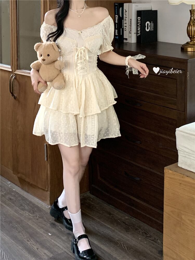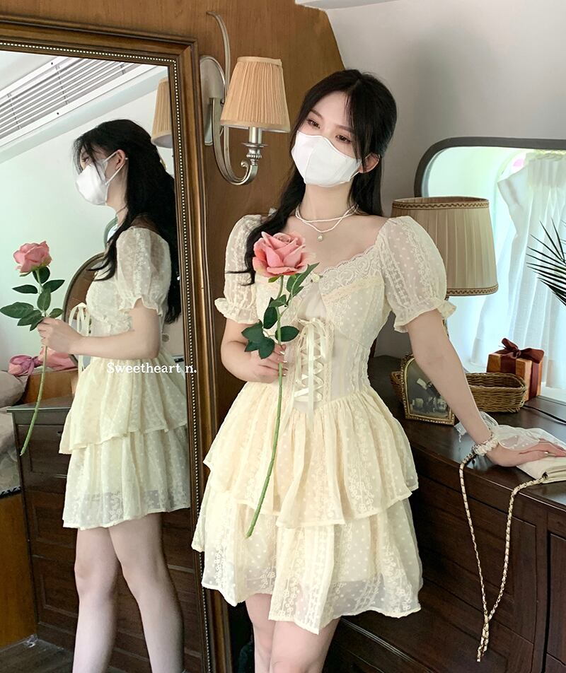 Pure lust style V-neck lace puff sleeve dress women's summer 2022 new bandage waist temperament cake skirt レース サマー 夏物 スカート Vネック 0921952586141372