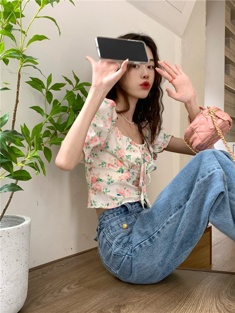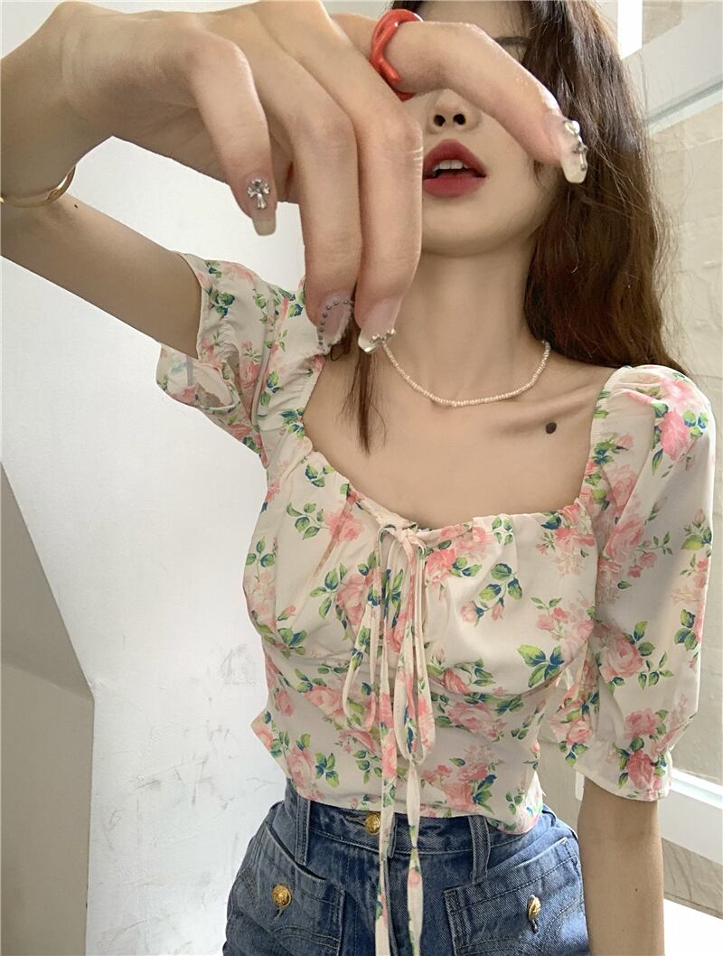 Sweet floral chiffon shirt women's design sense niche summer 2022 new lace-up V-neck slim short top ショート シフォン レース 大人ガーリー スウィート キュート カジュアル サマー 夏物 花柄 Vネック スリム レースアップ 0921971865915634