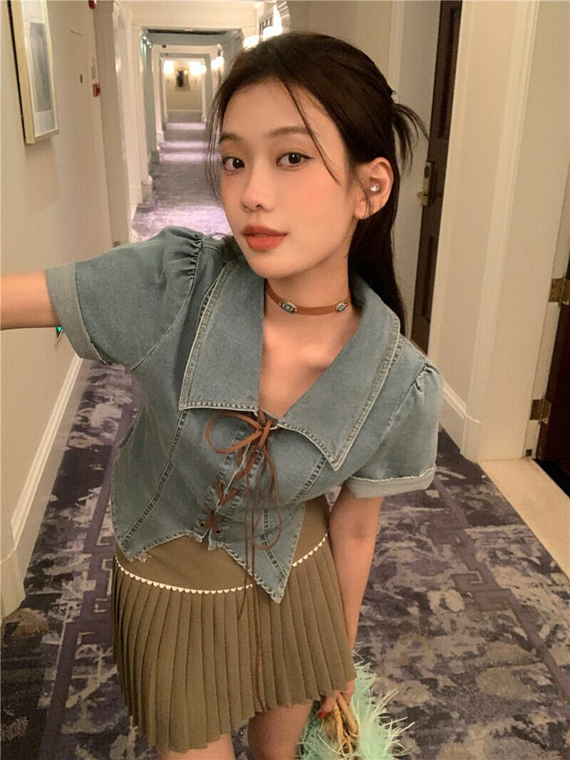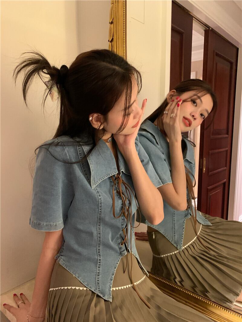 Retro chic strappy short-sleeved denim shirt women's summer 2022 new design sense niche slim short top ショート レトロ サマー 夏物 スリム 0921950667032335