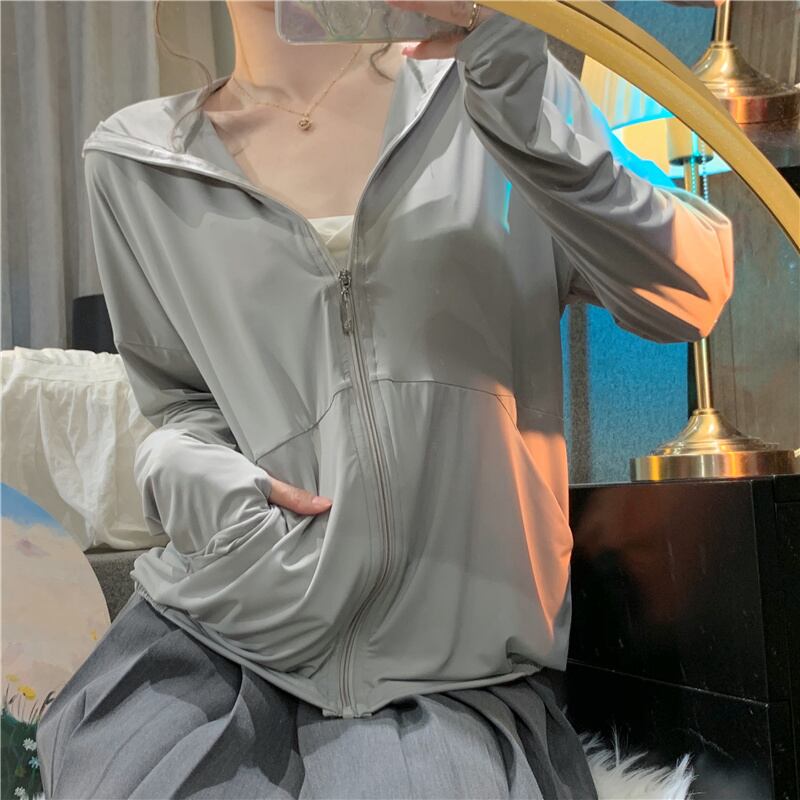 Thin ice silk hooded long-sleeved t-shirt women's summer 2022 new version all-match zipper loose sunscreen top tide ロング サマー 夏物 シルク Tシャツ 0921963718886681