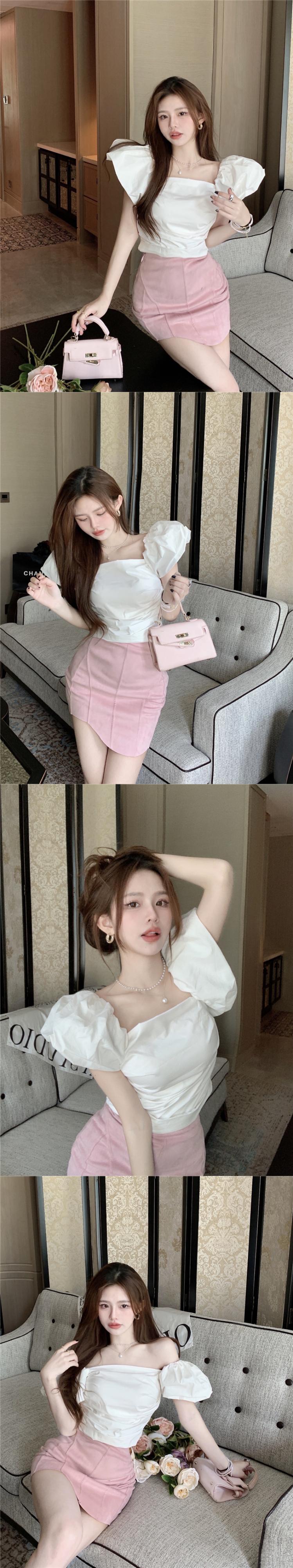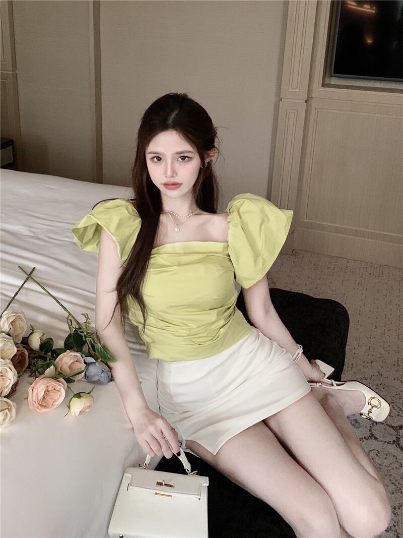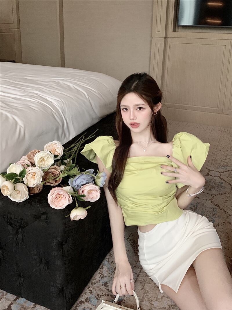 French Green Square Collar Shirt Women's Summer 2022 Chic Bow Knot Slim Fit Short Puff Sleeve Top Trendy ショート リボン サマー 夏物 スリム グリーン スクウェア 0921998539858736