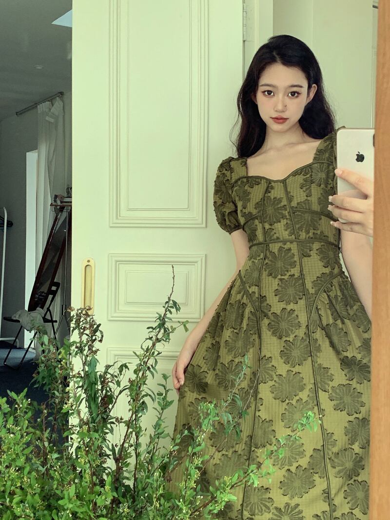 Retro green floral puff sleeve dress female summer 2022 new French pleated waist mid-length skirt レトロ プリーツ サマー 夏物 花柄 スカート グリーン 0921946600313071