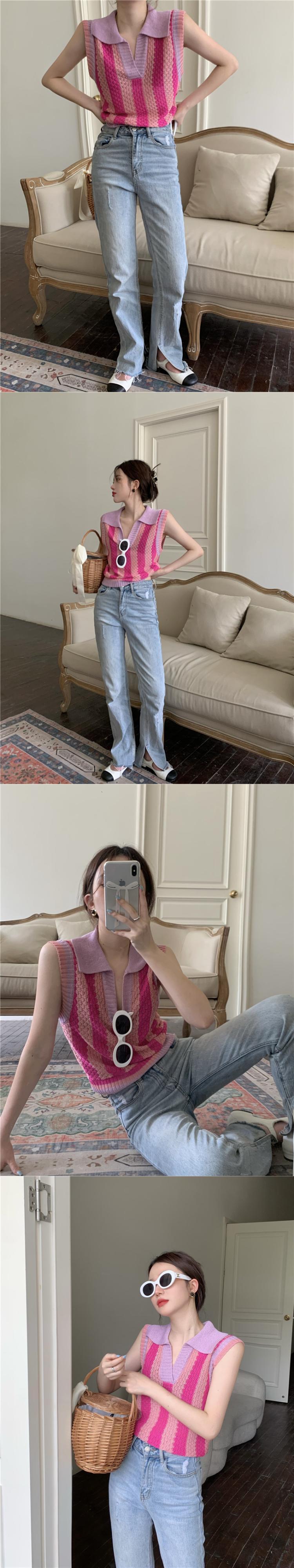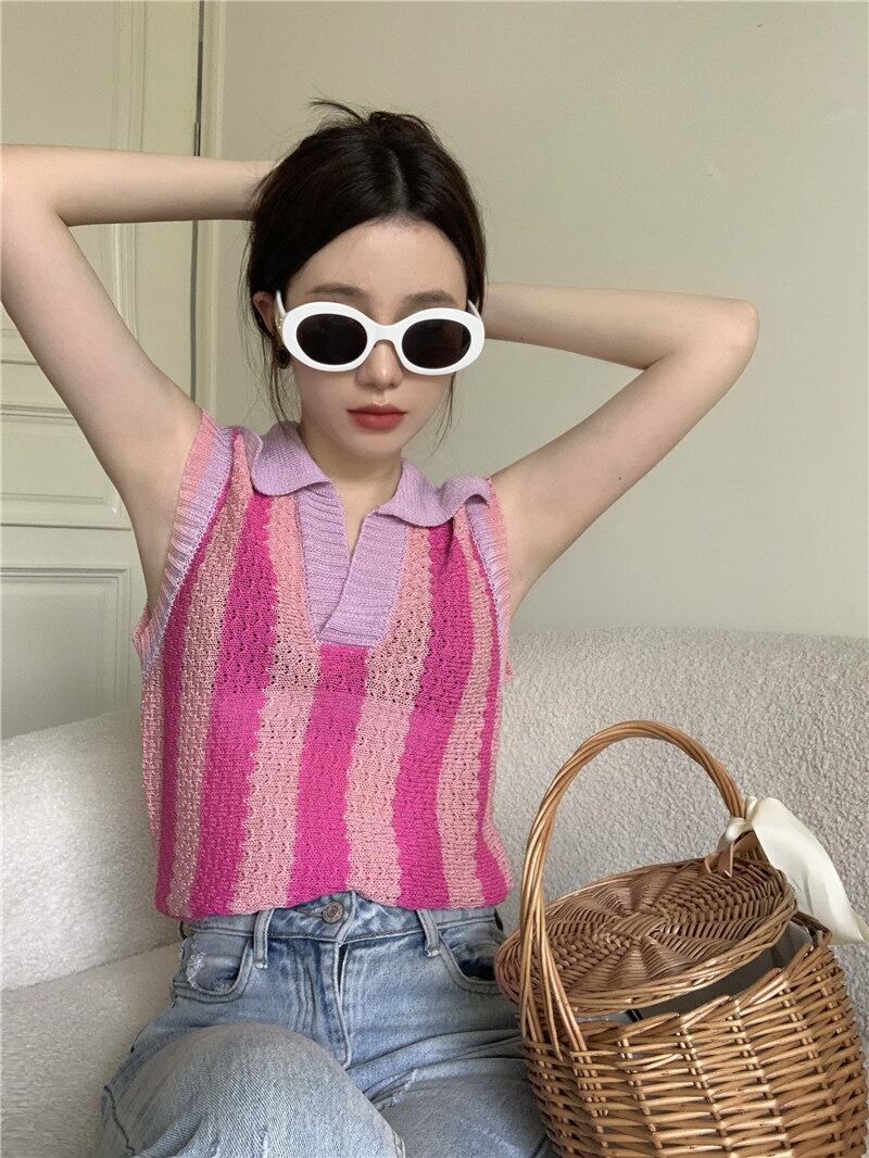 Contrast color striped polo collar knitted vest women's summer wear 2022 new slim fit inside a chic sleeveless top サマー 夏物 ノースリーブ ストライプ スリム 0921974445104653