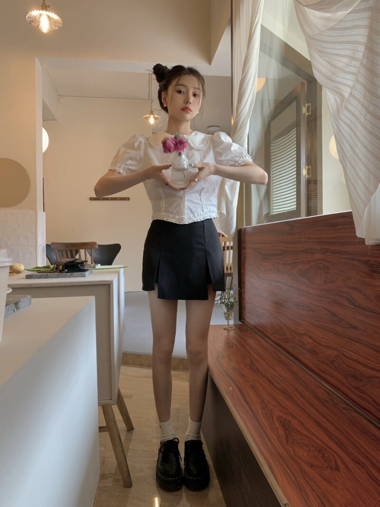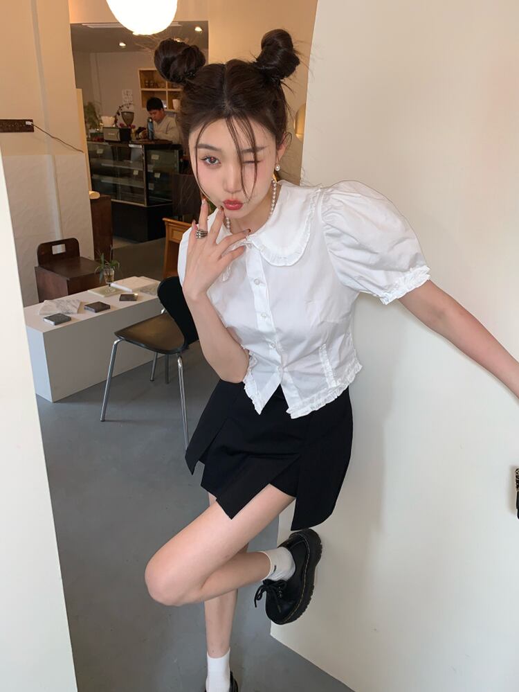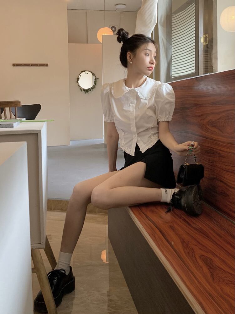 Chic white doll collar shirt with fungus edge women's summer 2022 new style slim puff sleeve short top ショート ホワイト サマー 夏物 スリム 0921965652224665