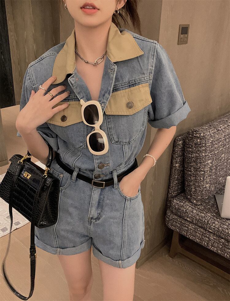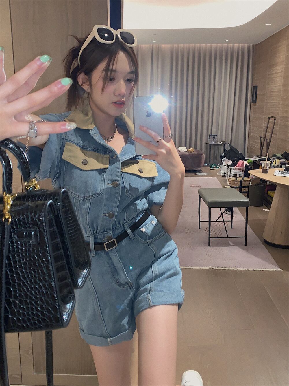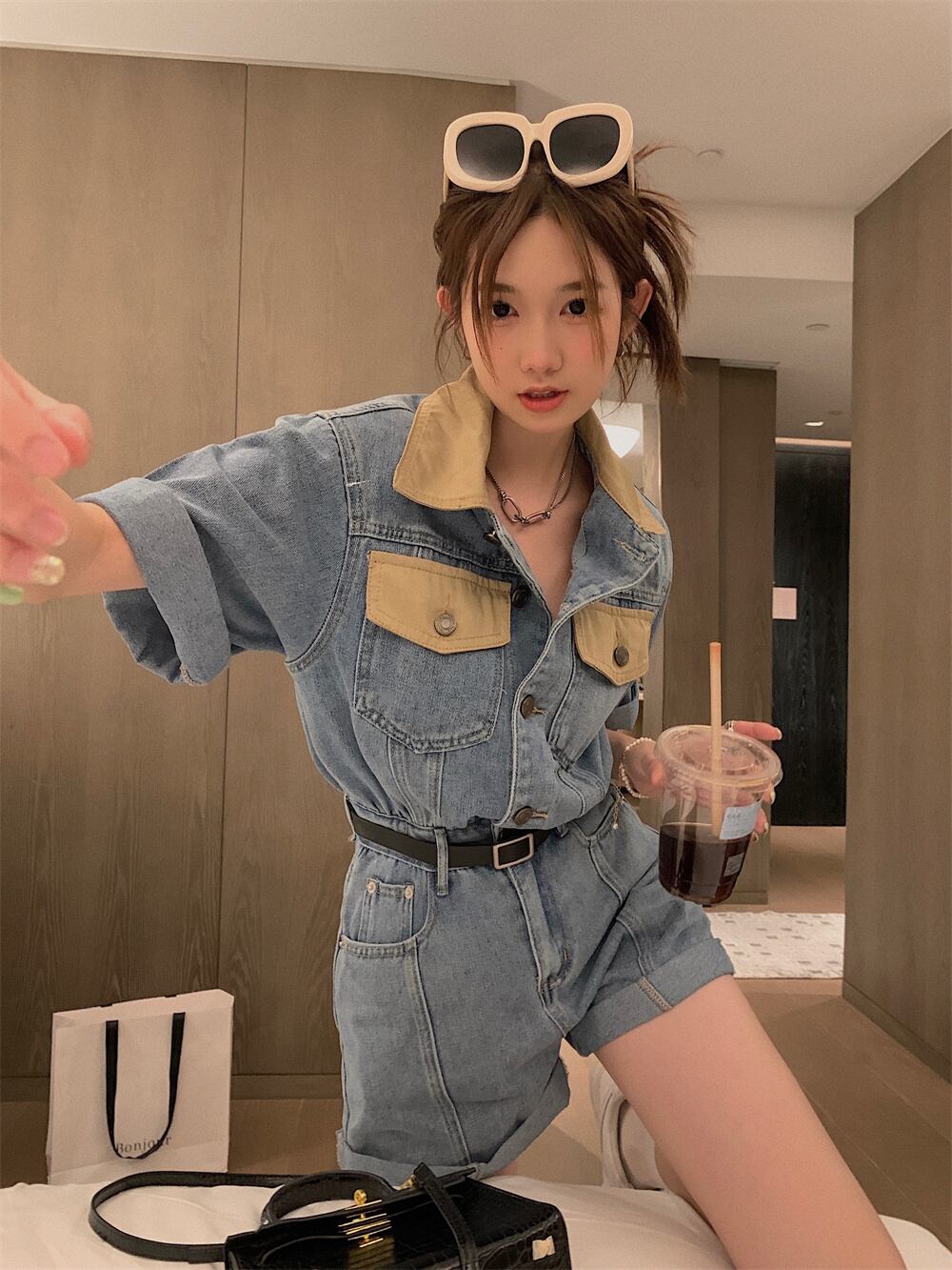 Retro Hong Kong-style short-sleeved denim one-piece shorts women's summer 2022 new high-end small wide-legged jumpsuit レトロ サマー 夏物 ショーツ ブルマー 092197832754022