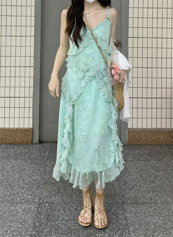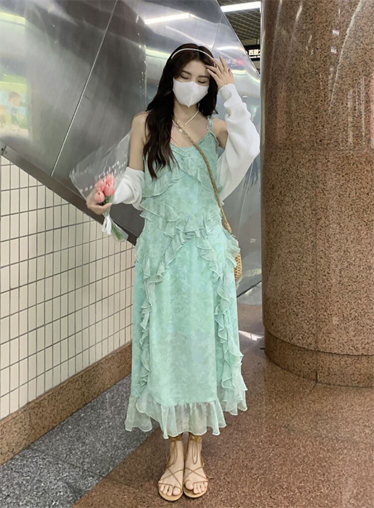 French ruffled floral suspender dress women's summer 2022 new V-neck waist mid-length slit skirt サマー 夏物 花柄 スカート Vネック 0921935710979394