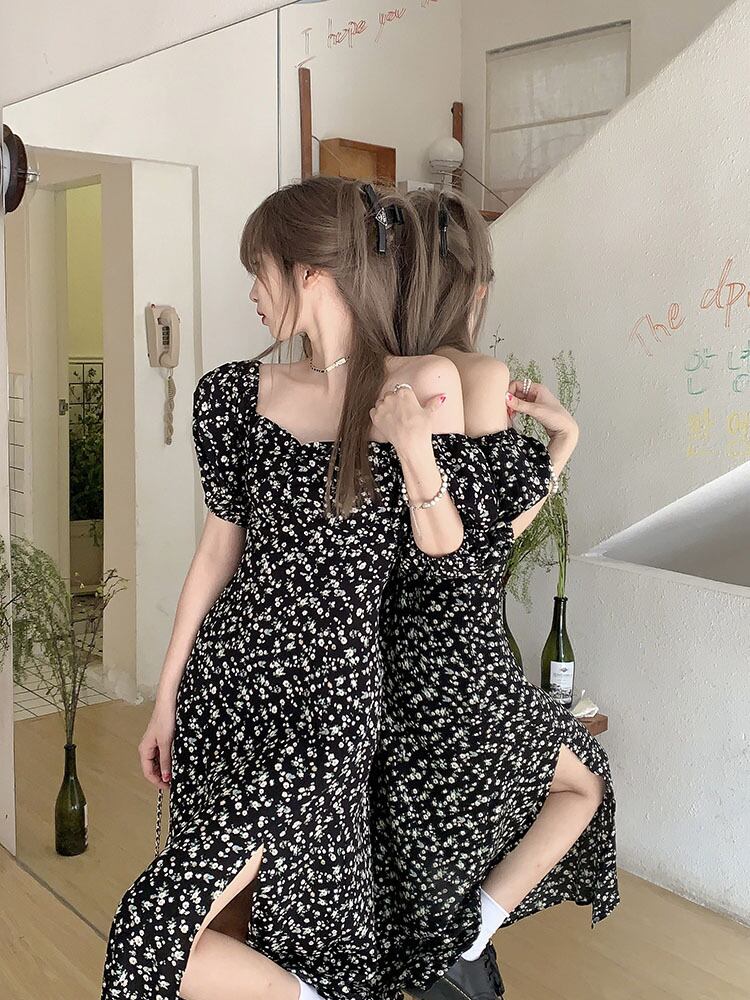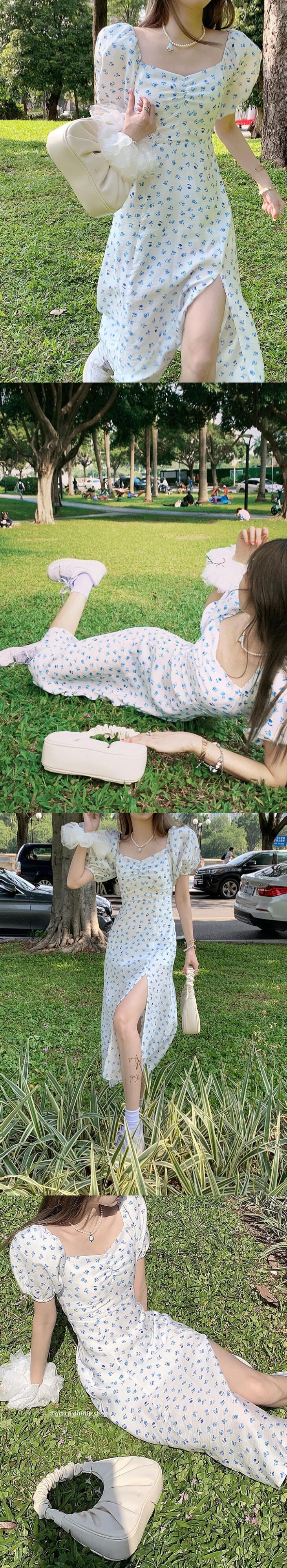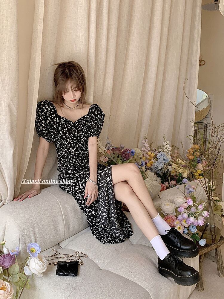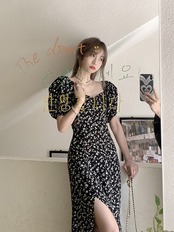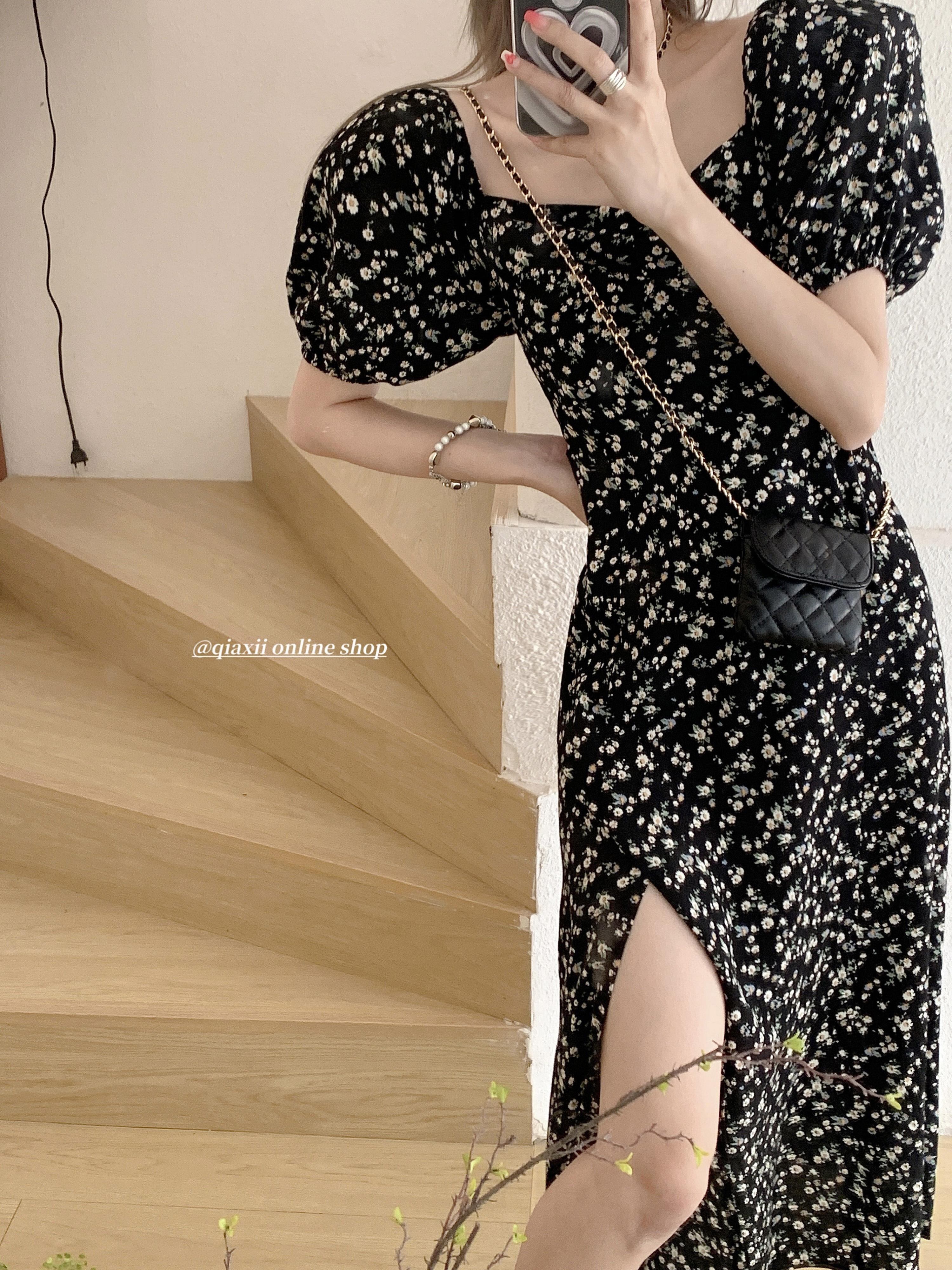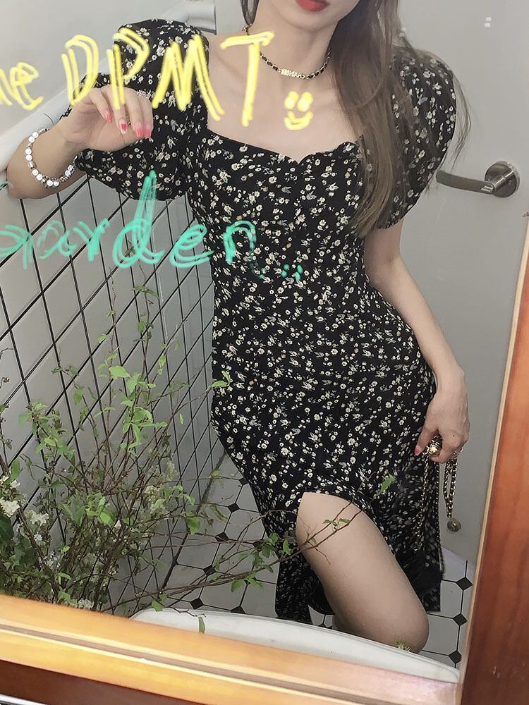 First love sweet puff sleeve floral dress female summer 2022 new temperament slit waist mid-length skirt 大人ガーリー スウィート キュート カジュアル サマー 夏物 花柄 スカート 0921972759537941