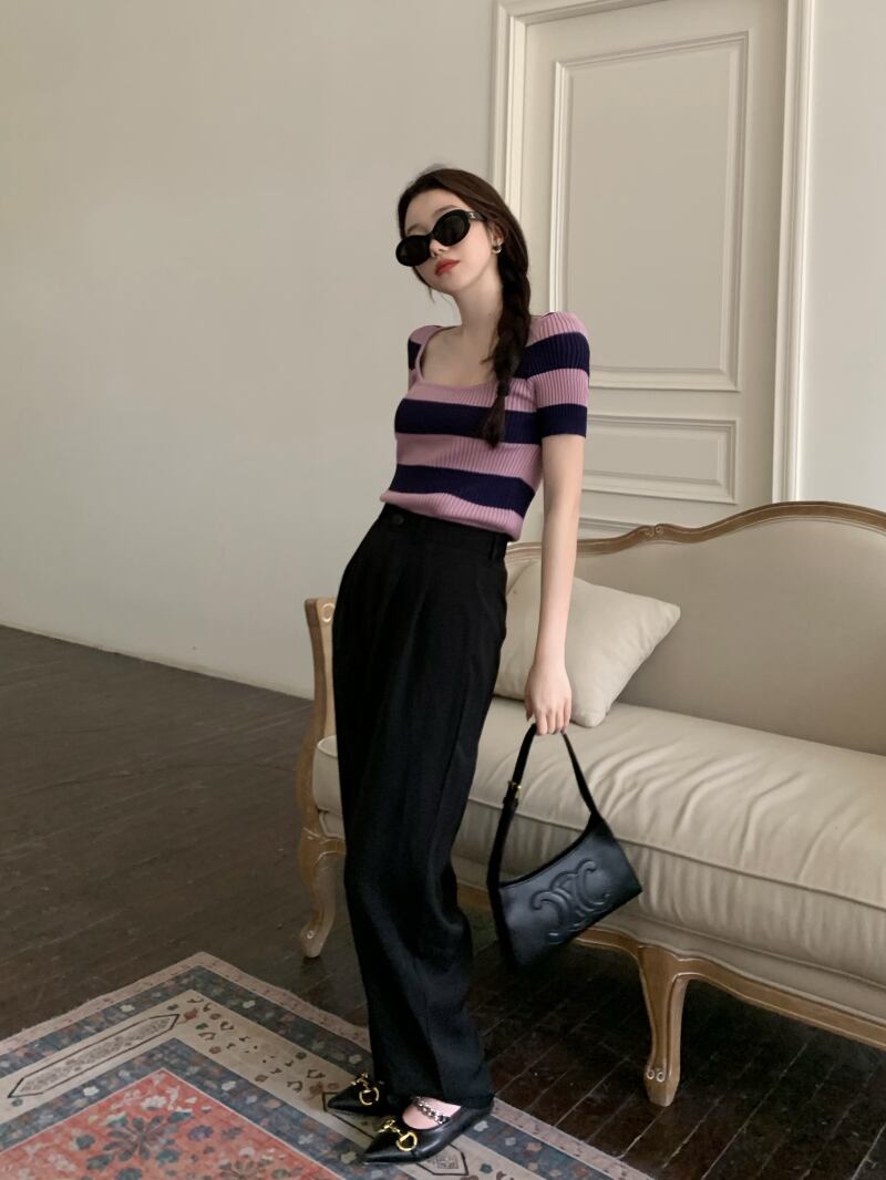 Retro temperament square neck striped short-sleeved T-shirt women's thin summer 2022 new temperament short top ins ショート レトロ サマー 夏物 ストライプ Tシャツ スクウェア 0921926895069557