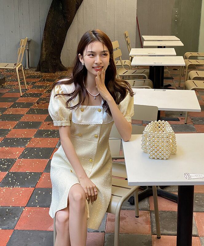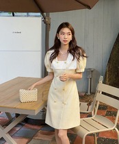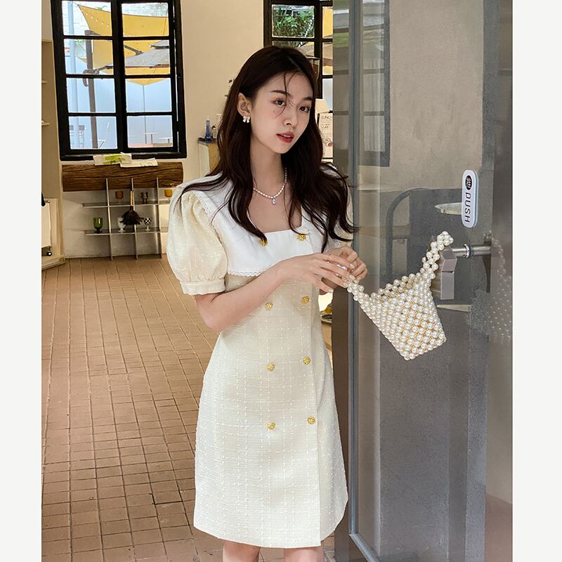 French high-end square neck puff sleeve dress women's summer 2022 new style small fragrance temperament waist A-line skirt サマー 夏物 スカート Aライン スクウェア 0921944754300136