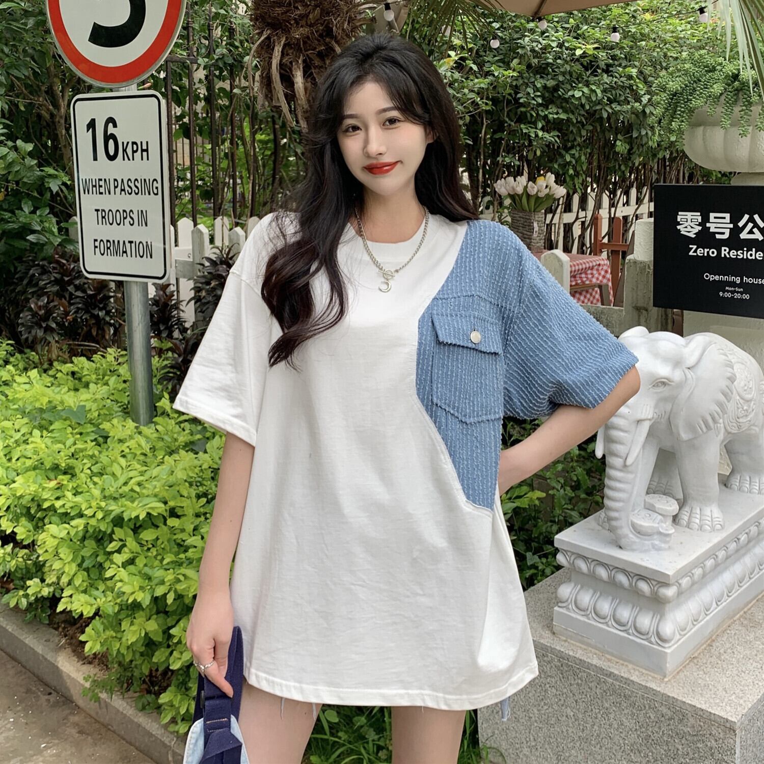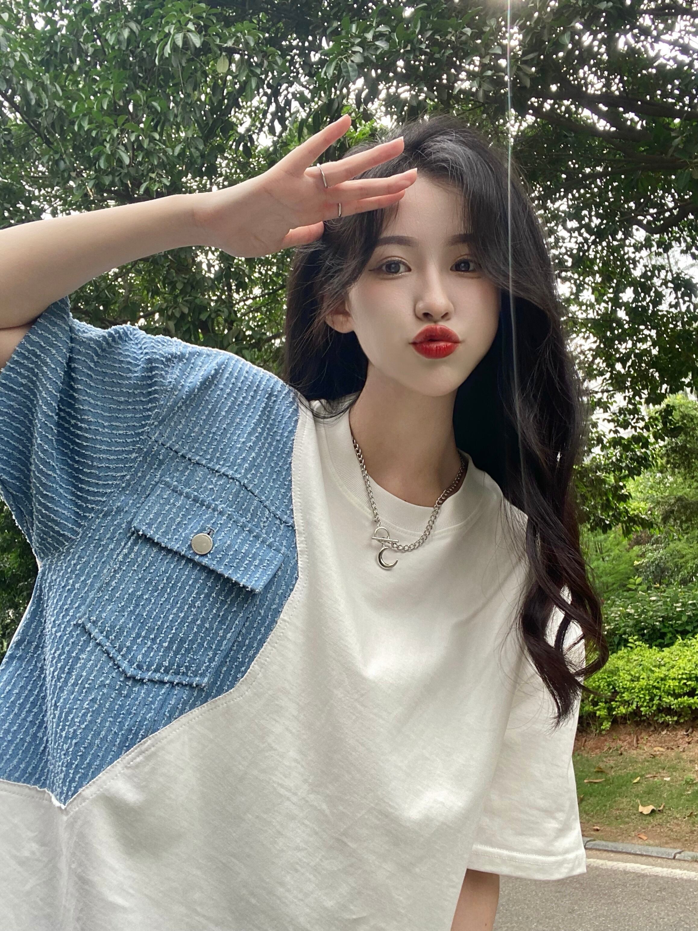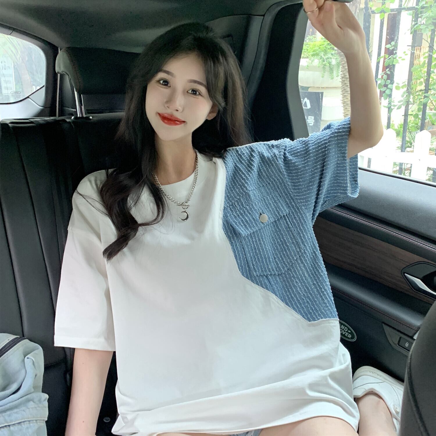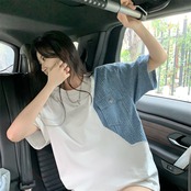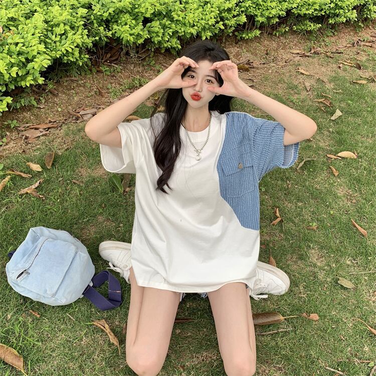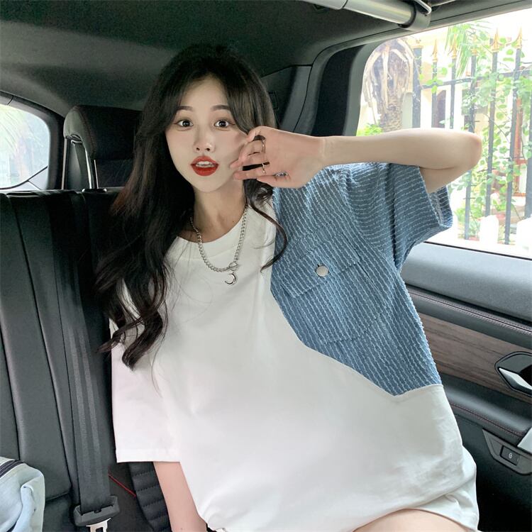 Net red design sense stitching short-sleeved t-shirt women's summer 2022 new version of the bf wind loose mid-length shirt tide レッド サマー 夏物 Tシャツ ステッチ 0921938760718888