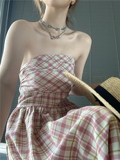Pure desire style one-shoulder plaid tube top dress women's summer 2022 new waist-length mid-length A-line skirt サマー 夏物 スカート Aライン 0921983743529237