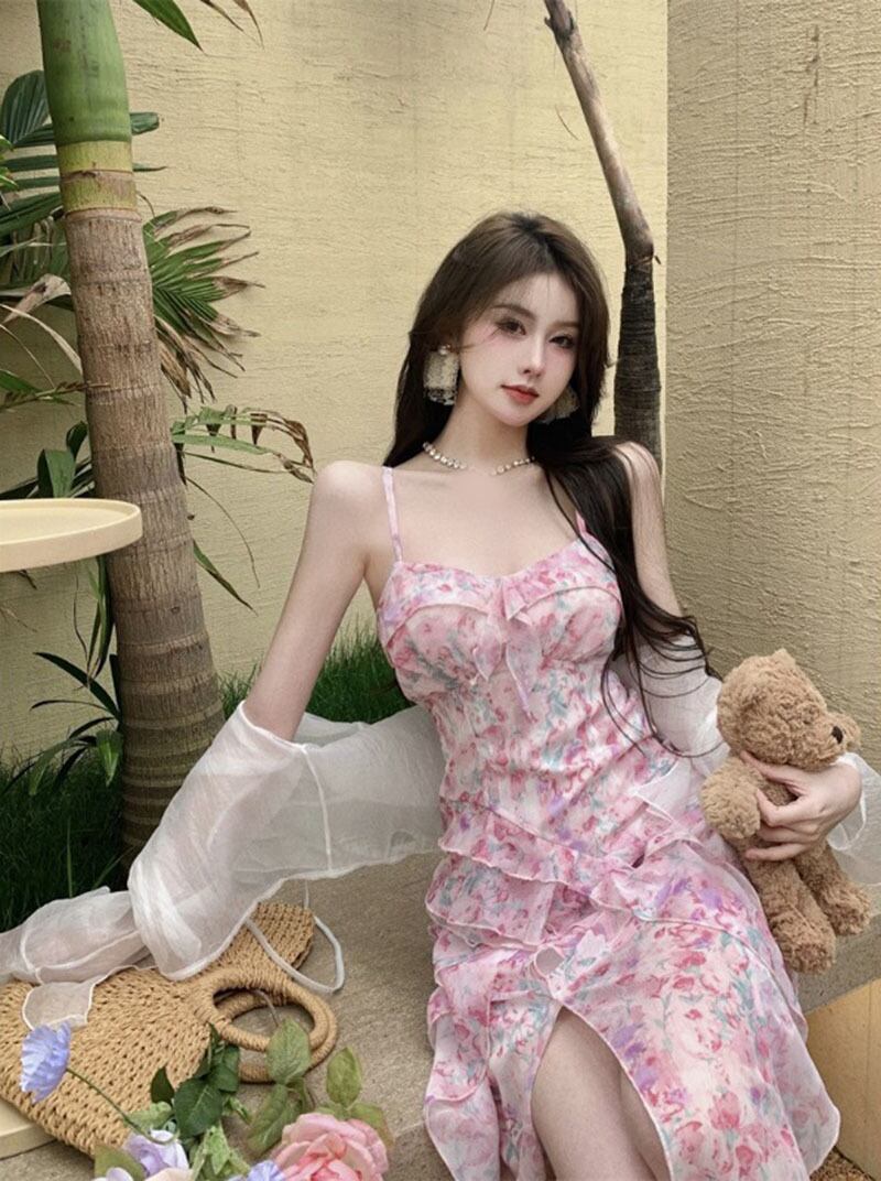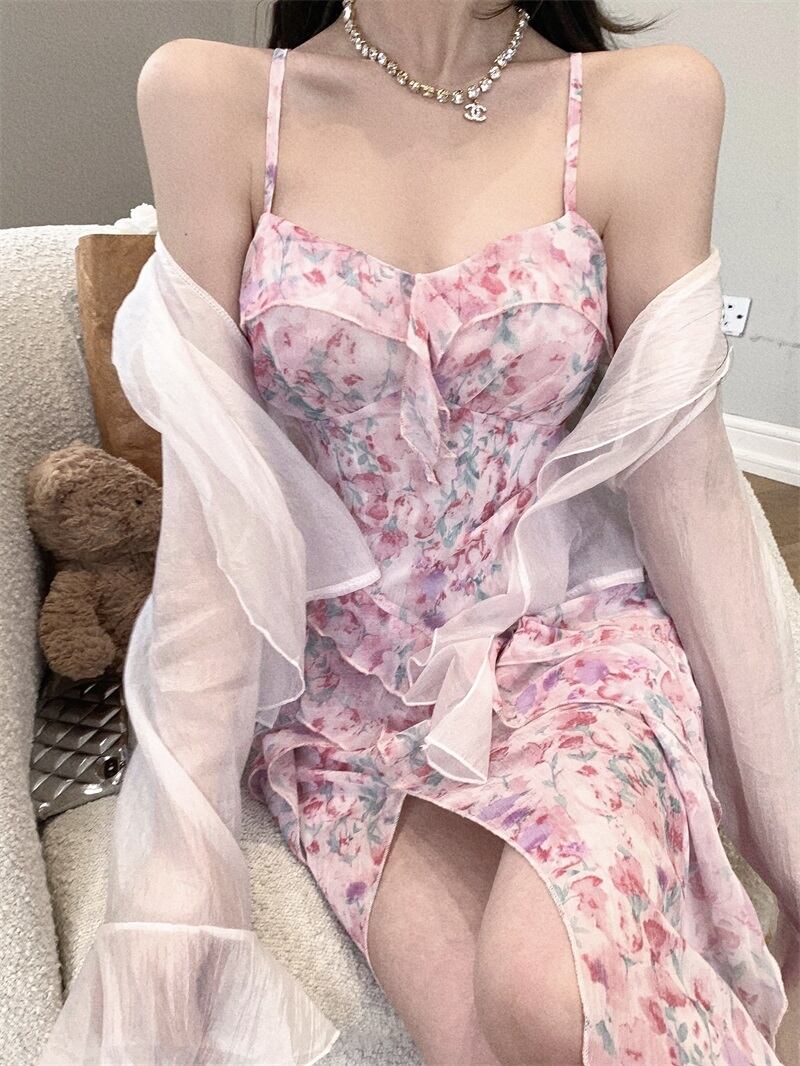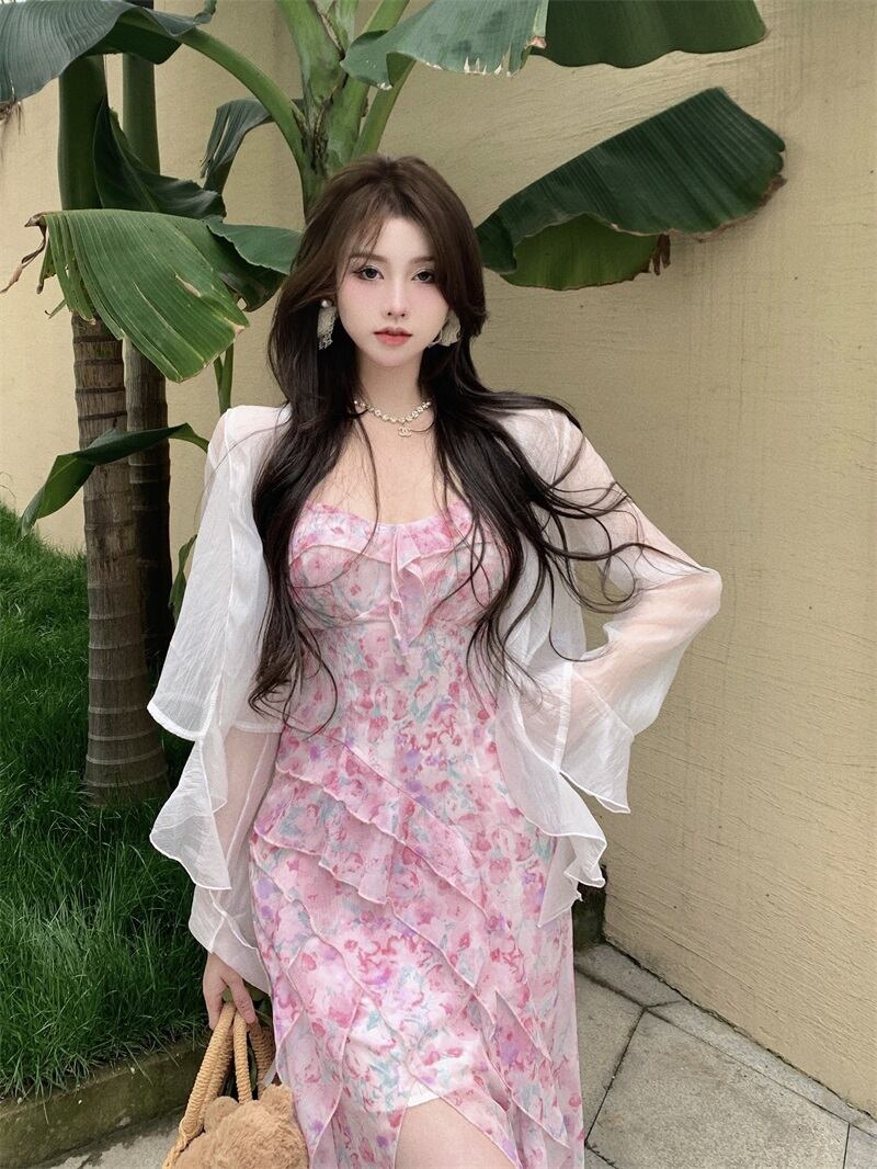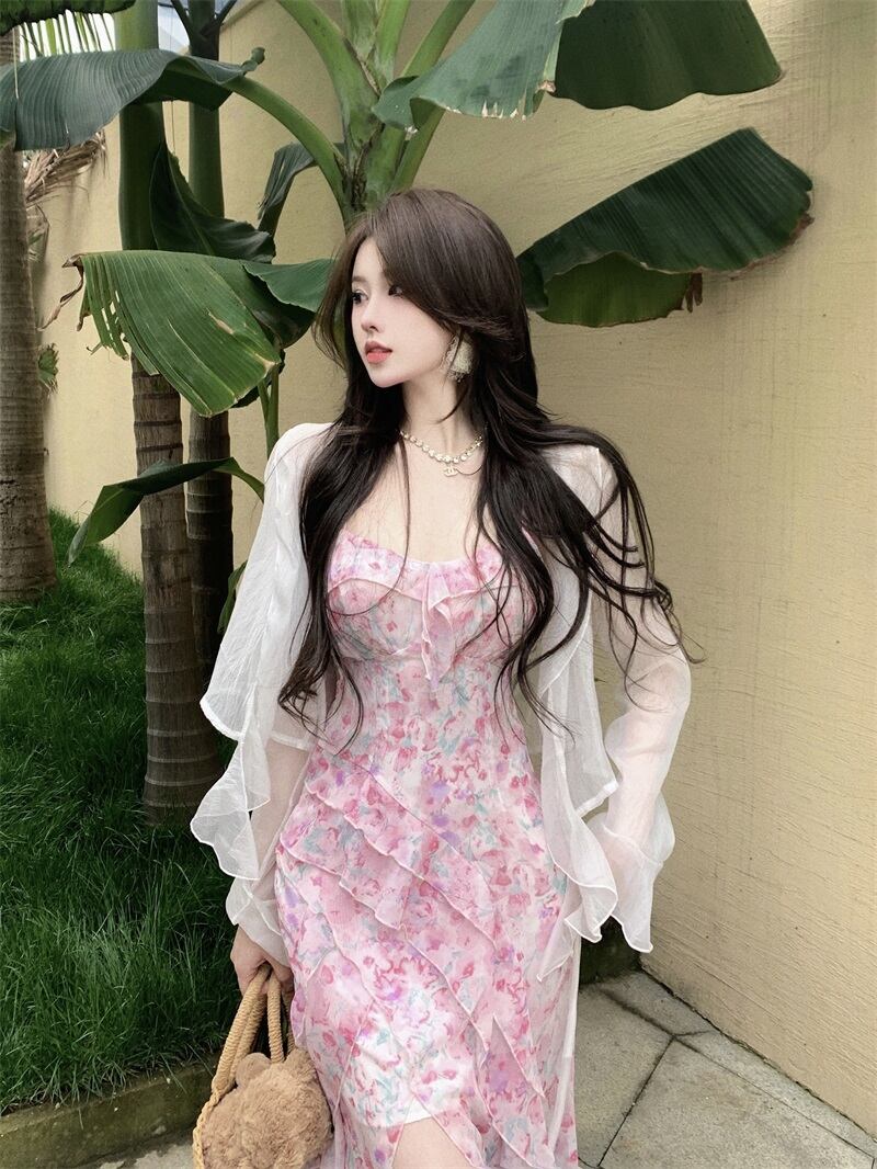 Super fairy lotus leaf suspender dress female summer 2022 new temperament backless pleated waist mid-length skirt プリーツ サマー 夏物 スカート 0921926842678490