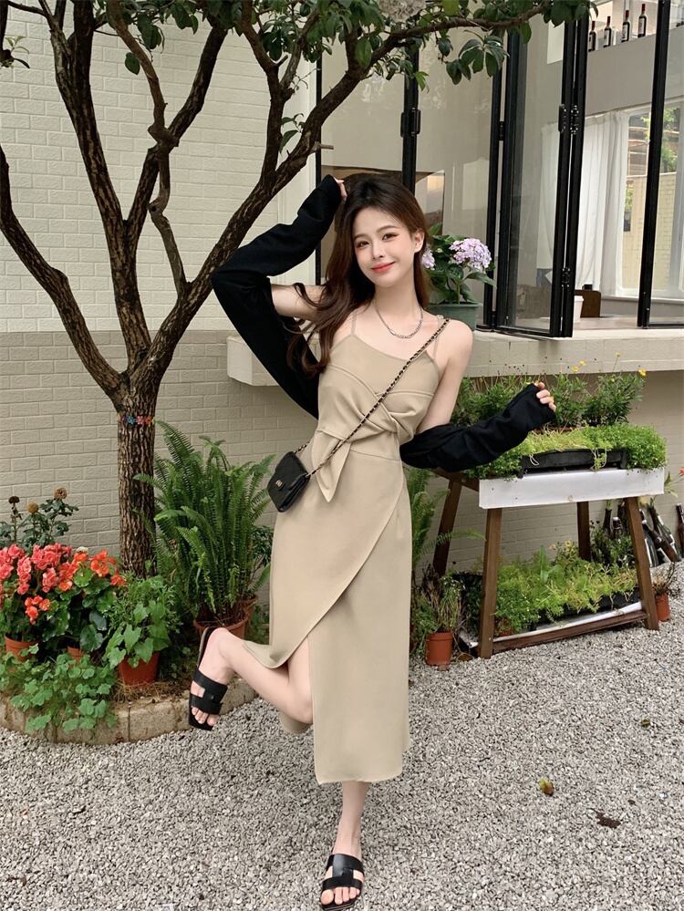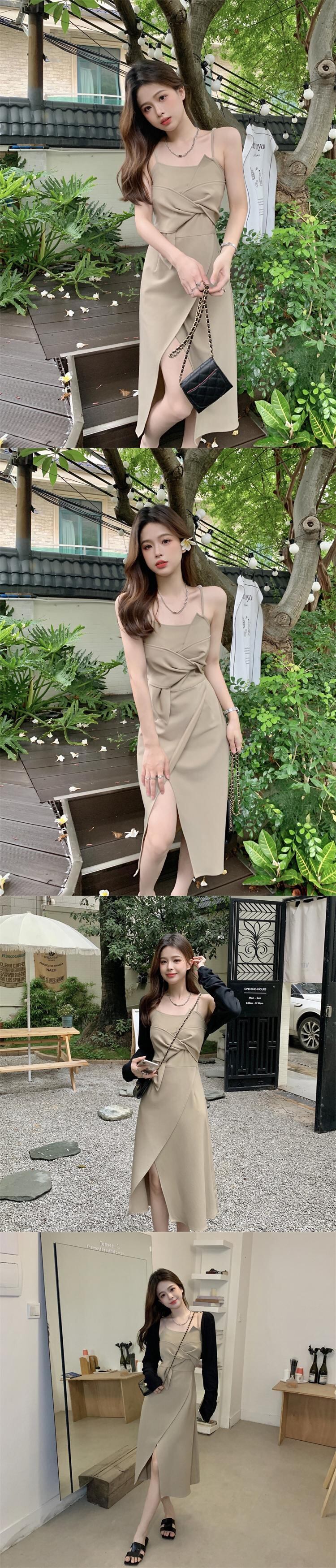 sense split bow suspender dress women's summer 2022 new temperament waist mid-length A-line skirt リボン サマー 夏物 スカート Aライン 0921999255535343