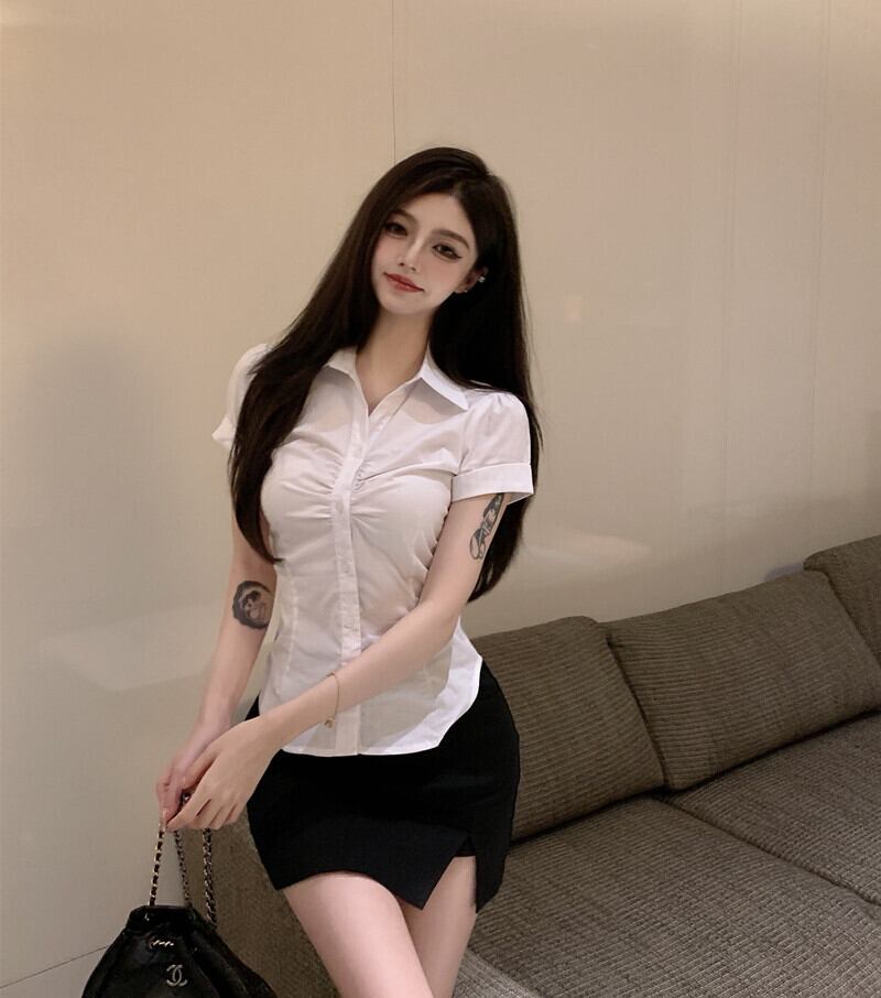 Chic pleated white short-sleeved shirt women's design sense niche summer 2022 new slim slim French top ホワイト プリーツ サマー 夏物 スリム 0921939908157090