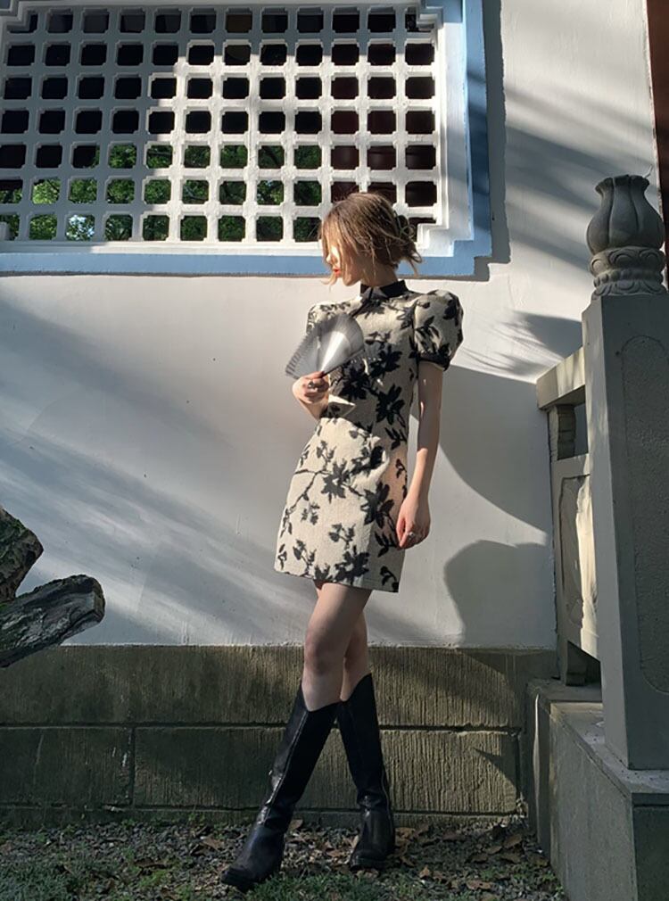 Retro new Chinese style puff sleeve dress female summer 2022 new temperament improved cheongsam waist skirt レトロ サマー 夏物 スカート 0921962683186485