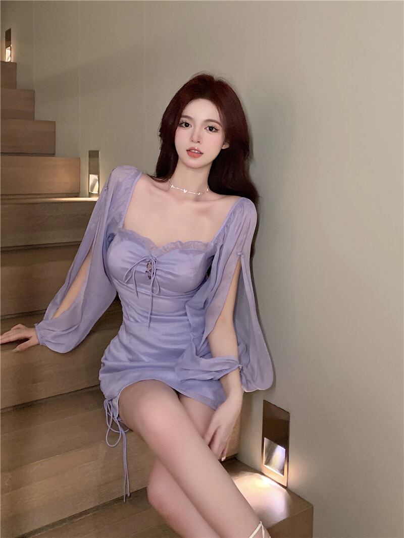 Pure desire wind purple chiffon dress women's summer 2022 new hollow long-sleeved waist drawstring bag hip skirt trendy ロング シフォン サマー 夏物 スカート パープル 092193130095731