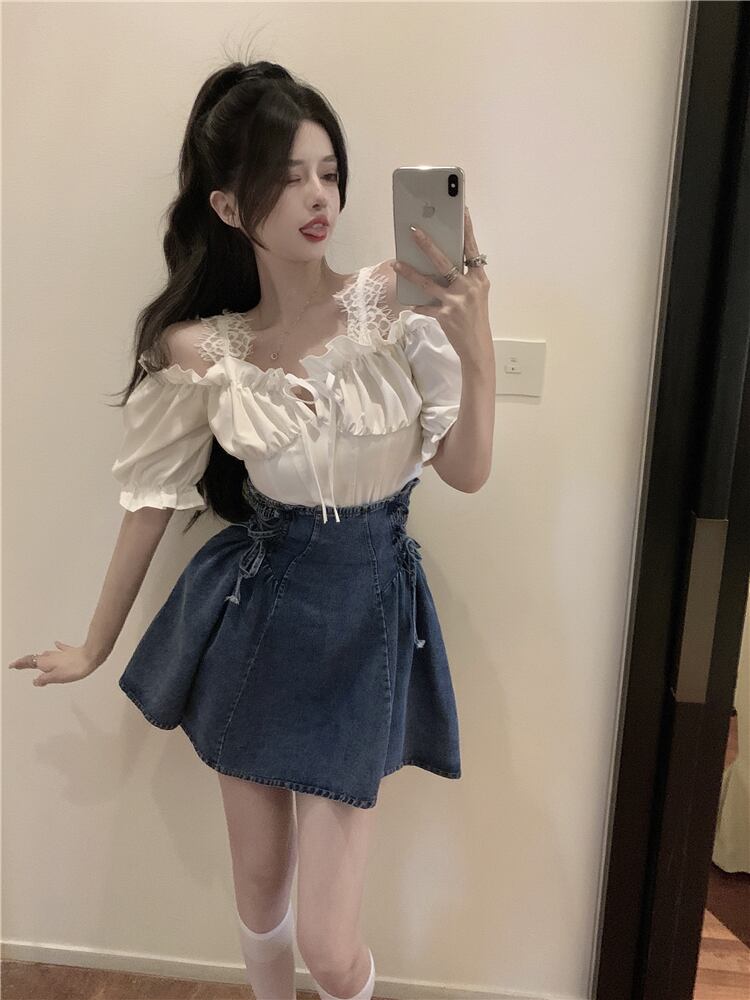 sense puff sleeves lace suspenders white shirt women's summer 2022 new temperament slim short top trendy ショート ホワイト レース サマー 夏物 スリム 0921940444935966