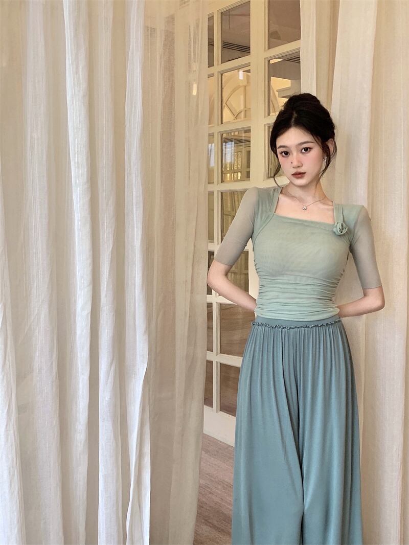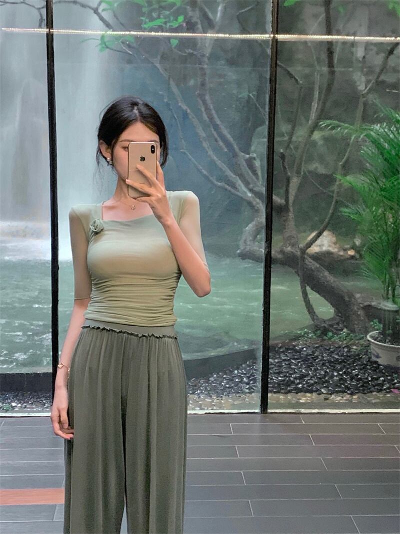 Retro three-dimensional rose mesh short-sleeved t-shirt women's summer 2022 new pleated slim square collar short top trendy ショート レトロ プリーツ サマー 夏物 メッシュ スリム Tシャツ スクウェア 0921991739955500