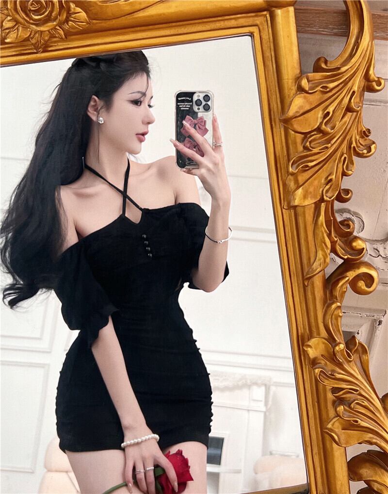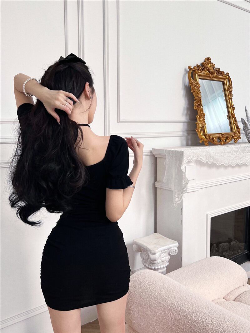 Hot black halter neck short-sleeved dress women's summer 2022 new style stitching lace waist slimming hip skirt ブラック レース サマー 夏物 スカート ステッチ 0921927783864822