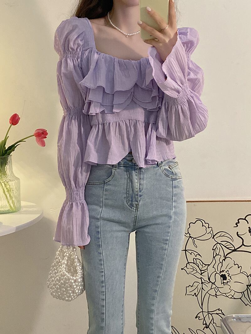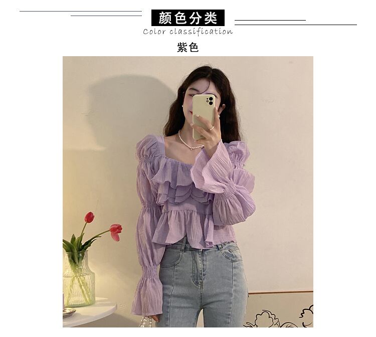 French gentle wind purple bell-sleeved shirt women's summer 2022 new temperament lotus leaf trim short top ショート サマー 夏物 パープル 0921966542320415