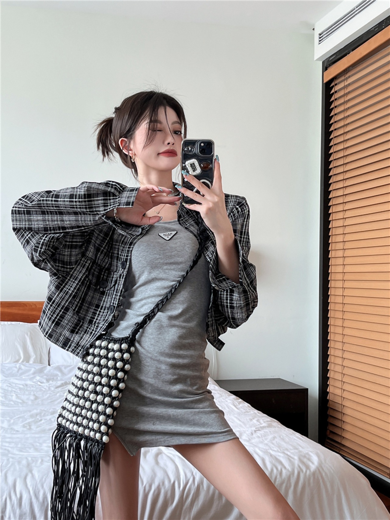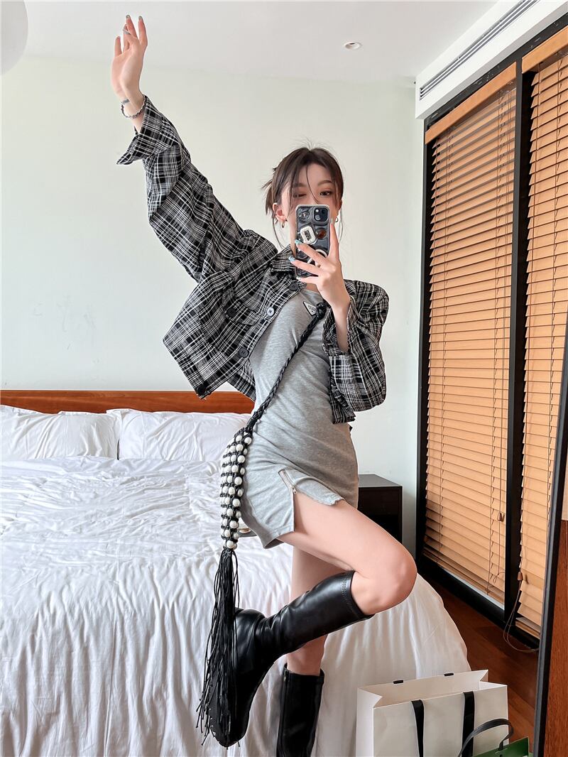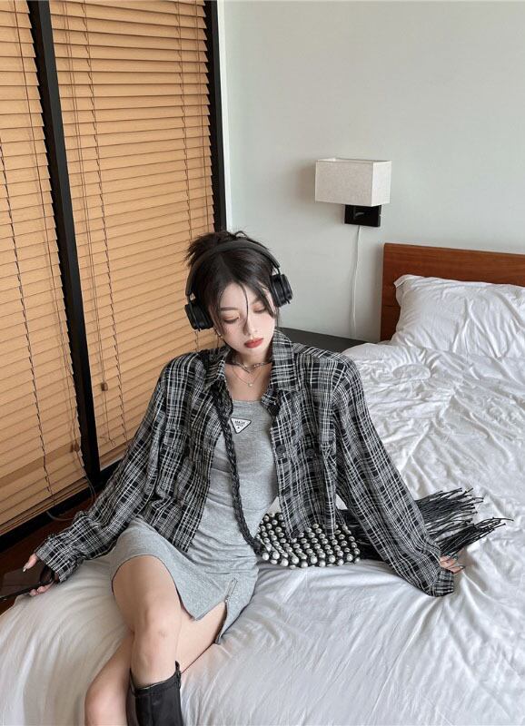 Retro plaid sunscreen shirt women's design sense niche summer 2022 new all-match chic short long-sleeved top ショート ロング レトロ サマー 夏物 0921961725888707