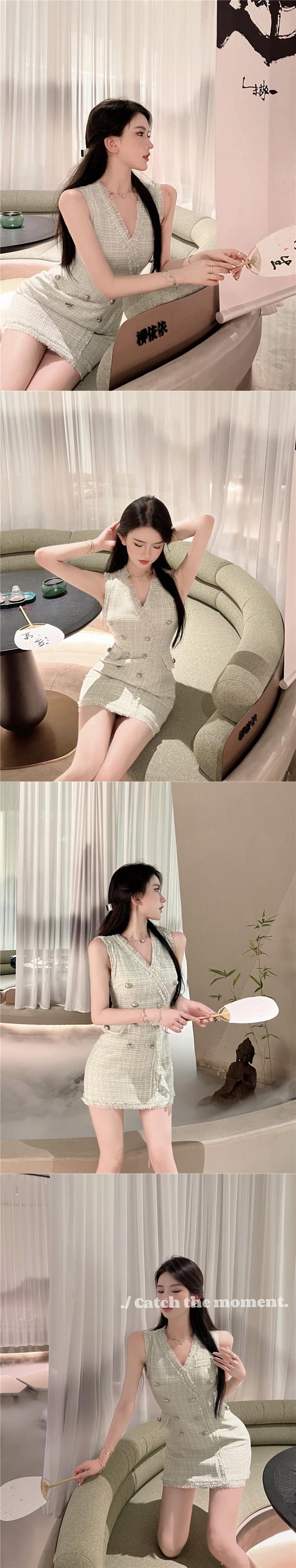 Xiaoxiangfeng white v-neck sleeveless dress women's summer 2022 new high-end double-breasted waist bag hip skirt ホワイト サマー 夏物 ノースリーブ スカート Vネック 0921925125000076