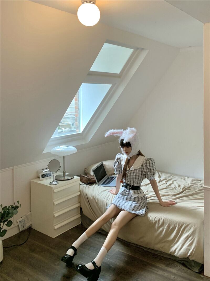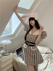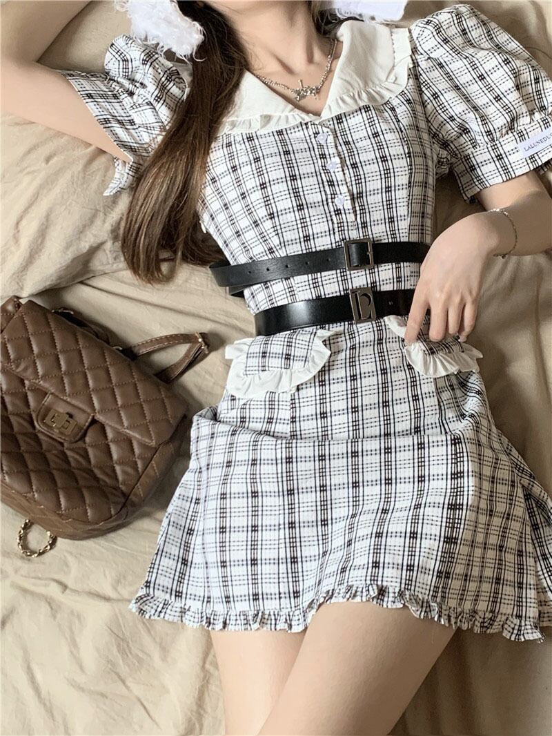 Retro doll collar plaid puff sleeve dress female summer 2022 new waist design sense fungus skirt レトロ サマー 夏物 スカート 0921977868413802