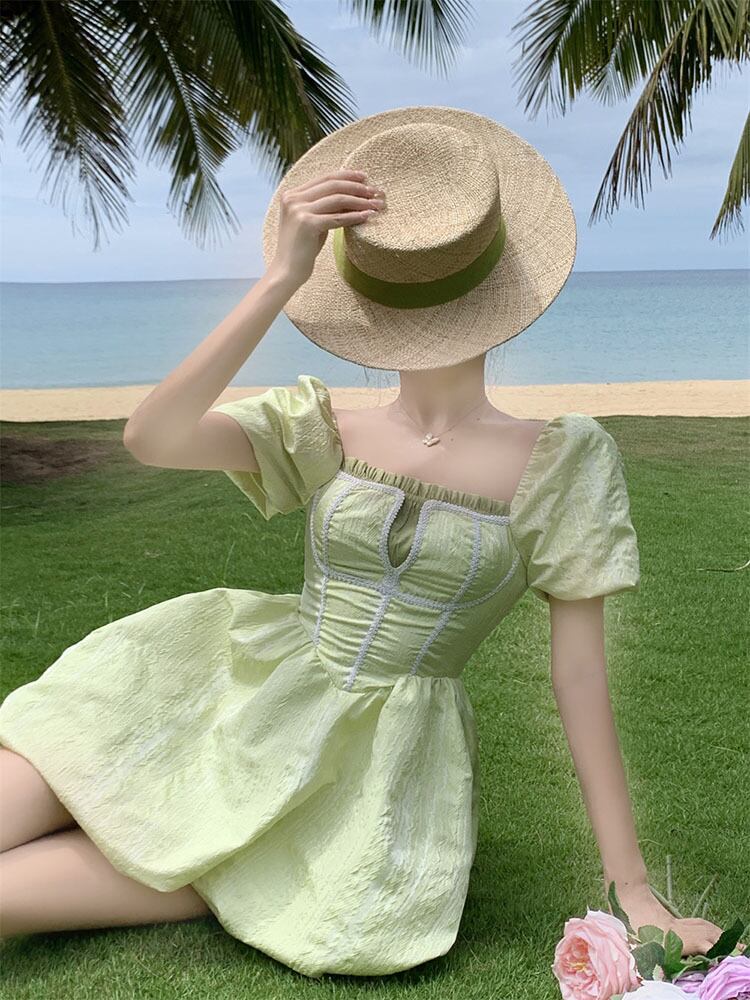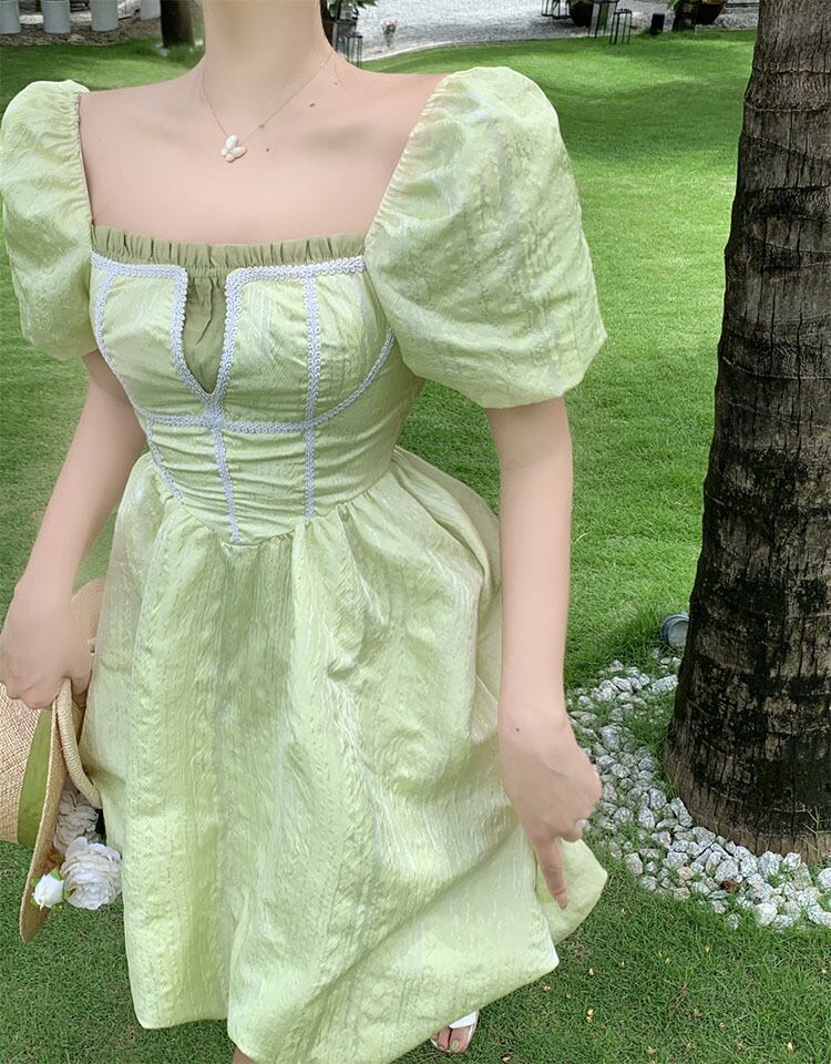 French temperament square collar green puff sleeve dress female summer 2022 new retro niche waist tutu skirt レトロ サマー 夏物 スカート パニエ ペチコート グリーン スクウェア 09219235078912