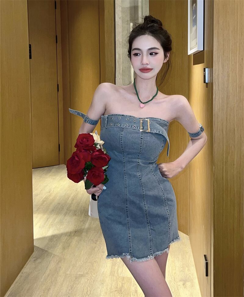 Retro temperament tight-fitting denim tube top dress female summer 2022 new strapless waist bag hip skirt レトロ サマー 夏物 スカート 0921911912961040