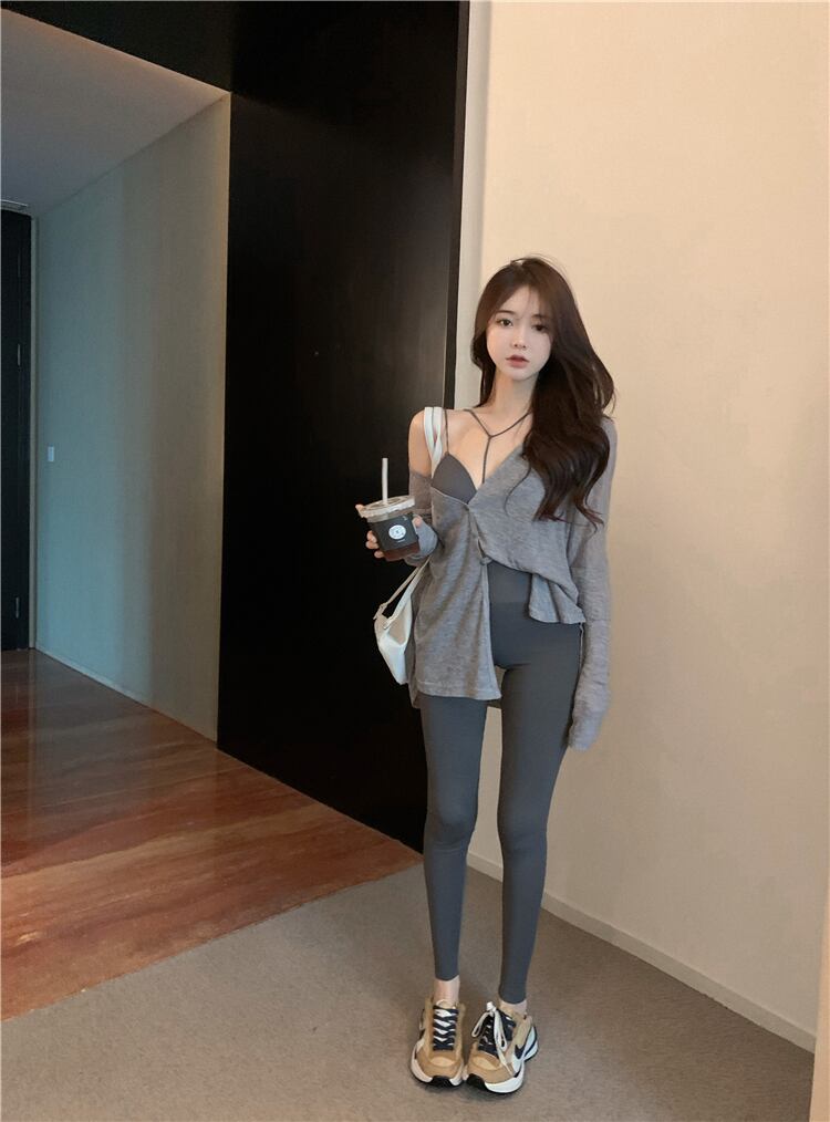 Lazy wind gray long-sleeved t-shirt women's summer 2022 new version all-match loose v-neck single-breasted sunscreen top ロング サマー 夏物 Vネック Tシャツ 0921930848388328
