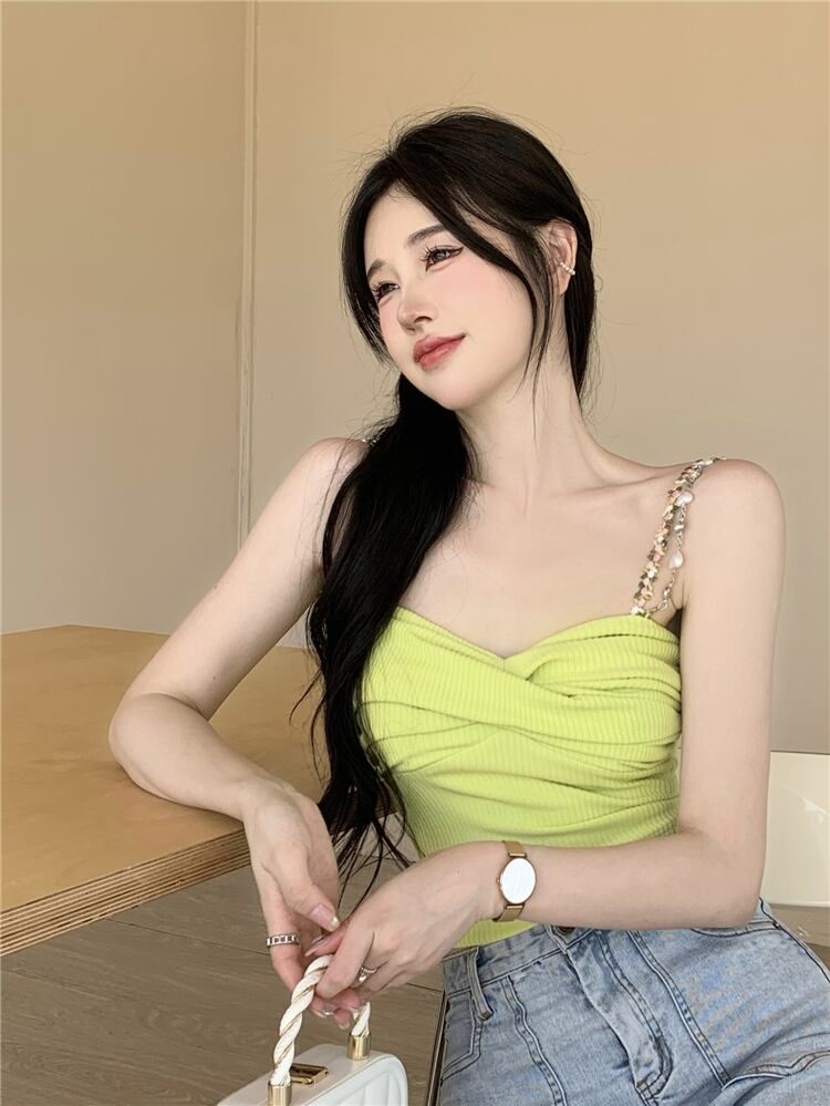 Spice Girls Pearl Chain Camisole Women's Inside Summer 2022 Green Slim Short Tops Wear Tide Outside ショート サマー 夏物 スリム パール 真珠 グリーン チェーン 0921995842281982
