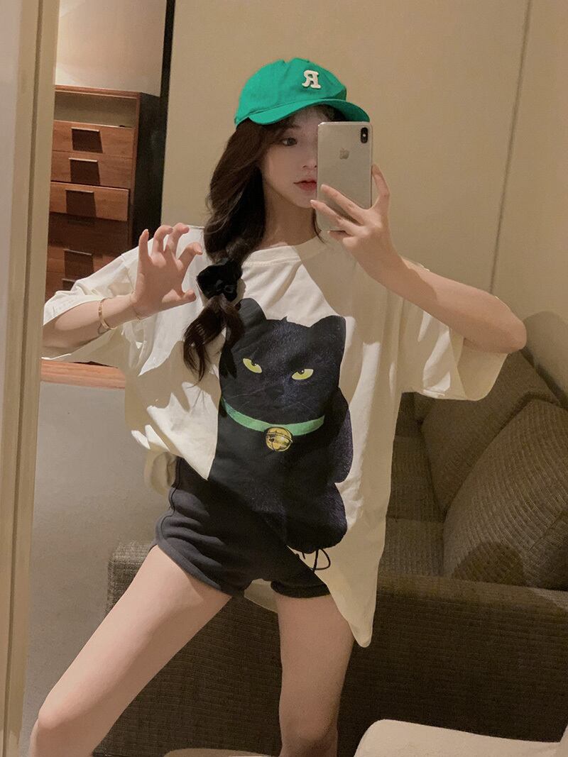 Cat print black t-shirt women's summer 2022 new version bf lazy wind loose mid-length half-sleeve top ブラック サマー 夏物 Tシャツ 0921973927824543