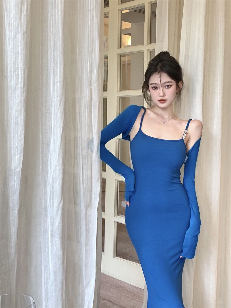 -quality blue letter suspender dress female summer 2022 new waist slim bag hip fishtail long skirt ロング ブルー サマー 夏物 スカート スリム 0921994619501861