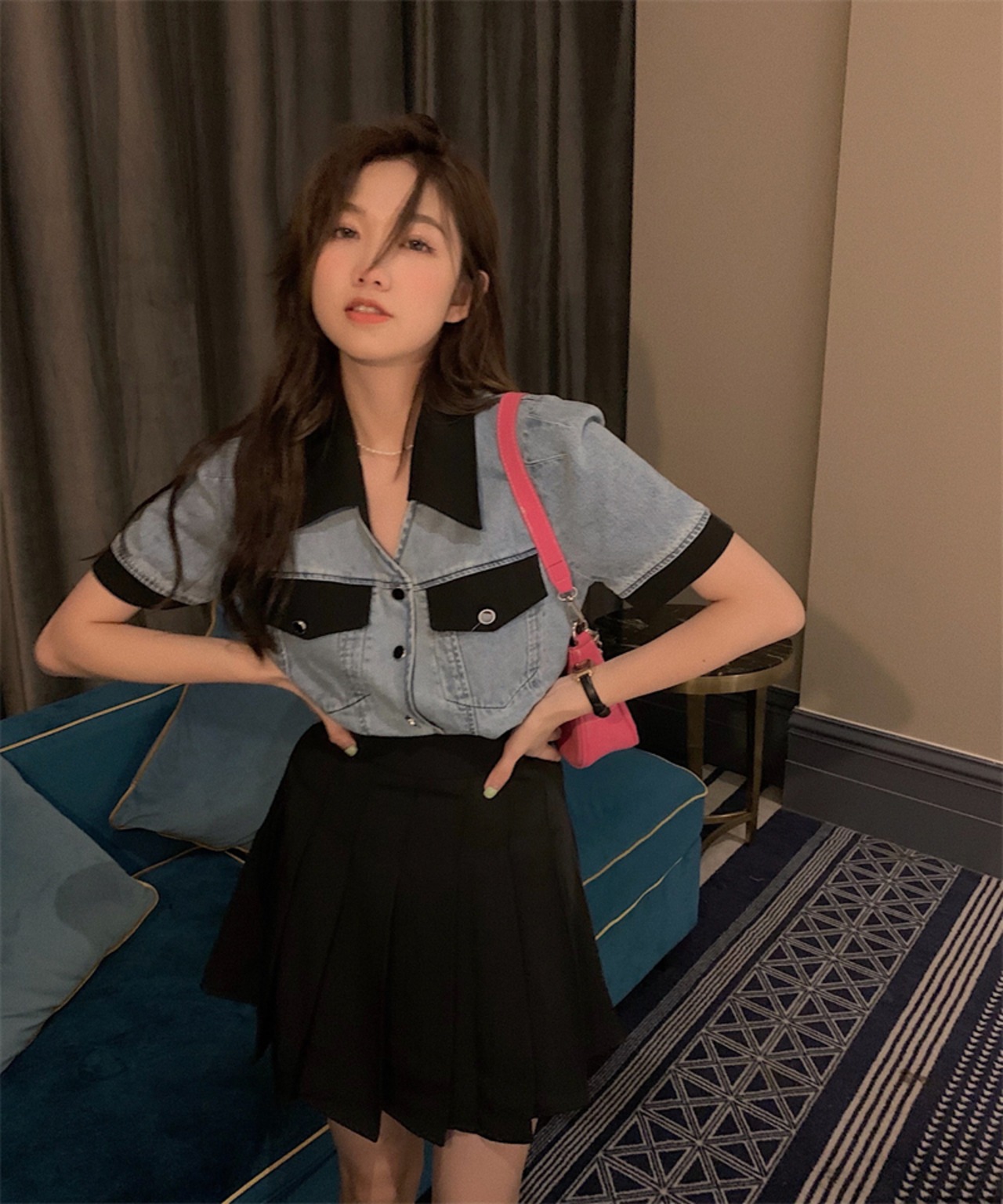 Chic color-blocking polo collar short-sleeved denim shirt women's summer 2022 new design small trendy short tops ショート サマー 夏物 0921912367974649