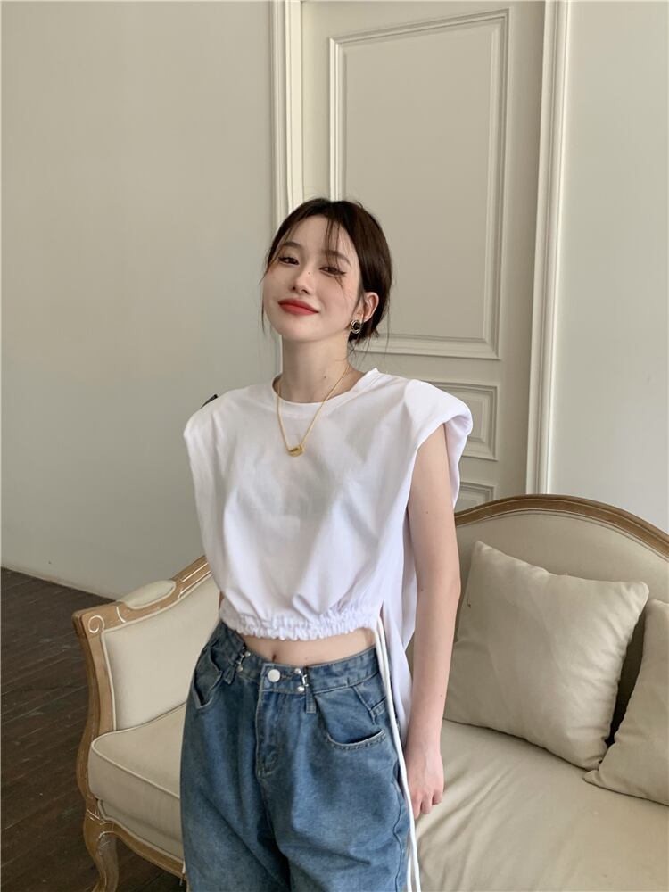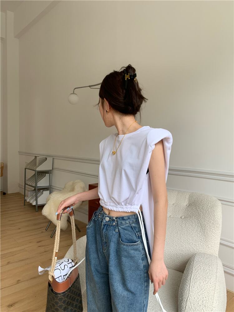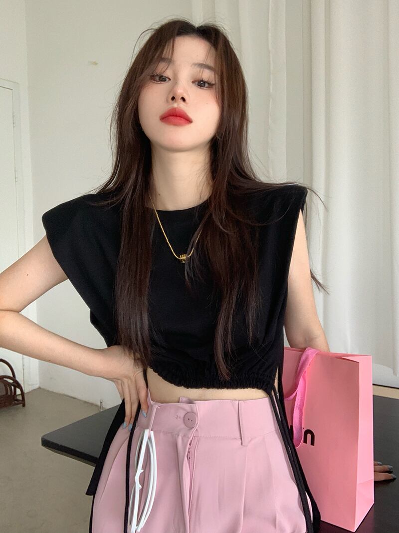 sense fashion shoulder pad sleeveless T-shirt women's summer 2022 new drawstring loose short top ins tide ショート サマー 夏物 ノースリーブ Tシャツ 0921993233026898