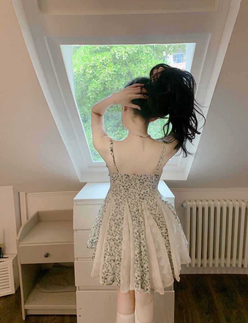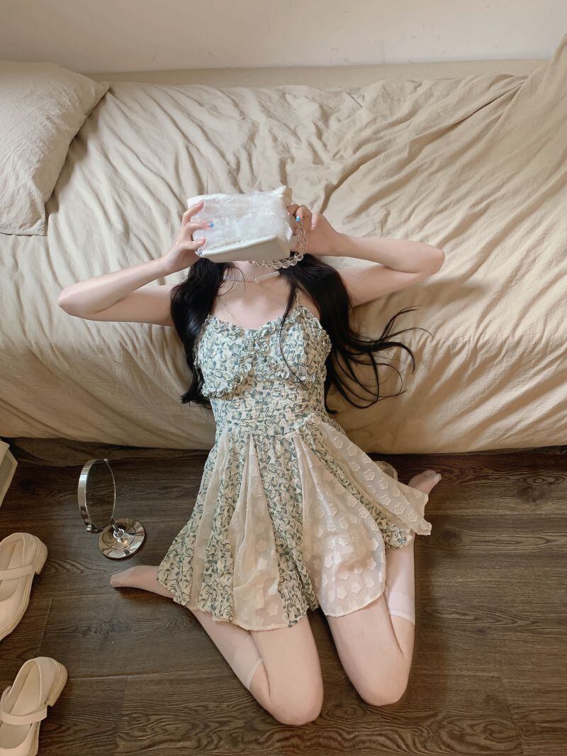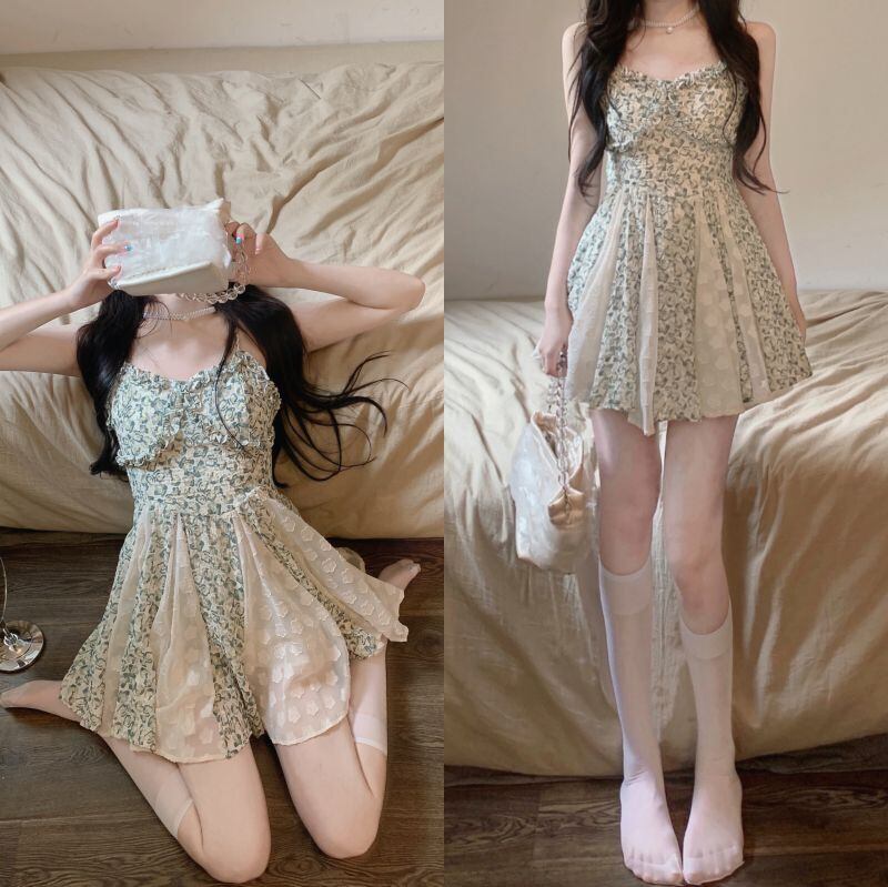 sense chic stitching floral suspender dress female summer 2022 new fungus edge waist A-line skirt サマー 夏物 花柄 スカート Aライン ステッチ 0921950591881917