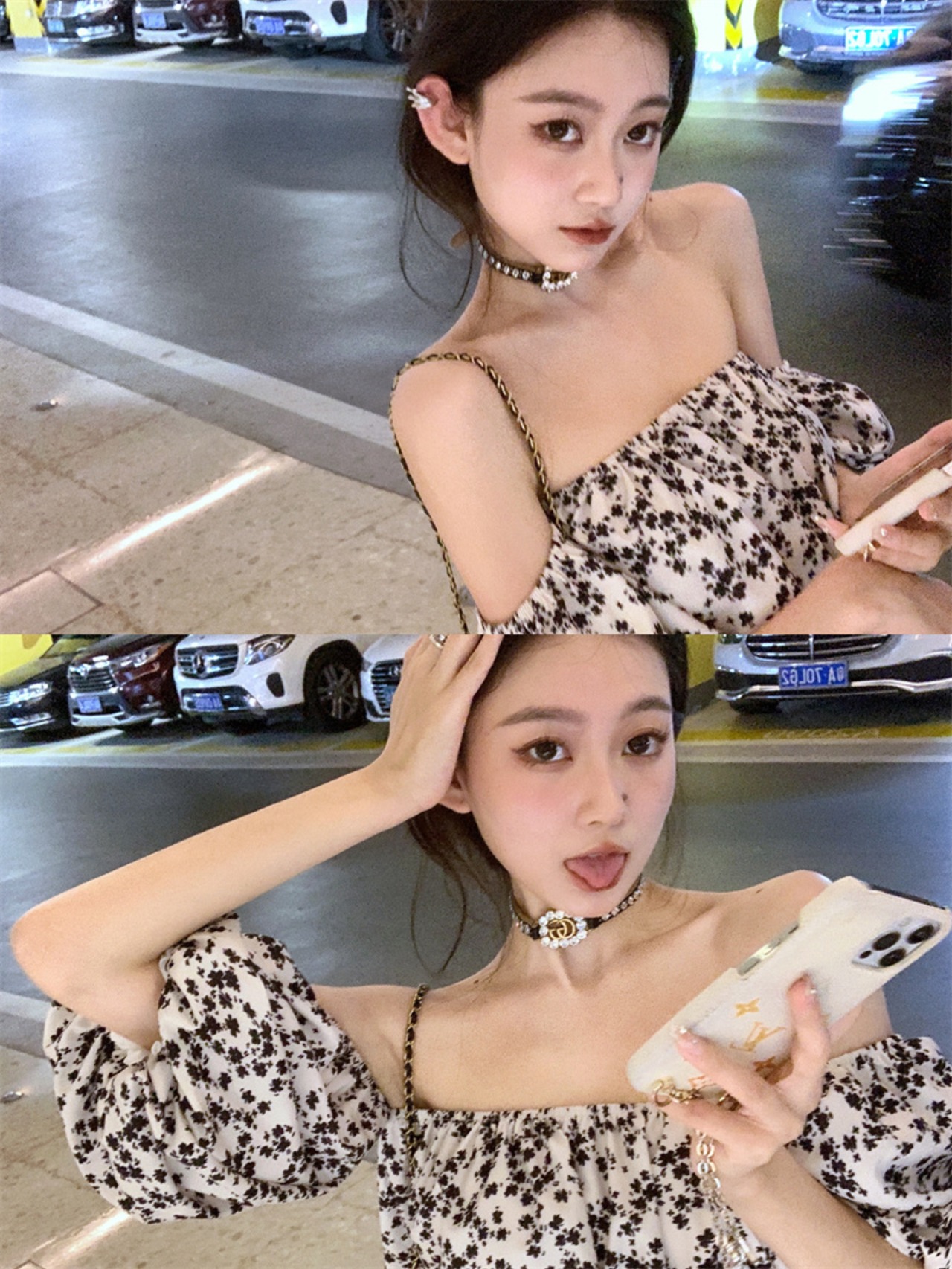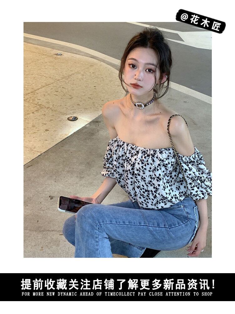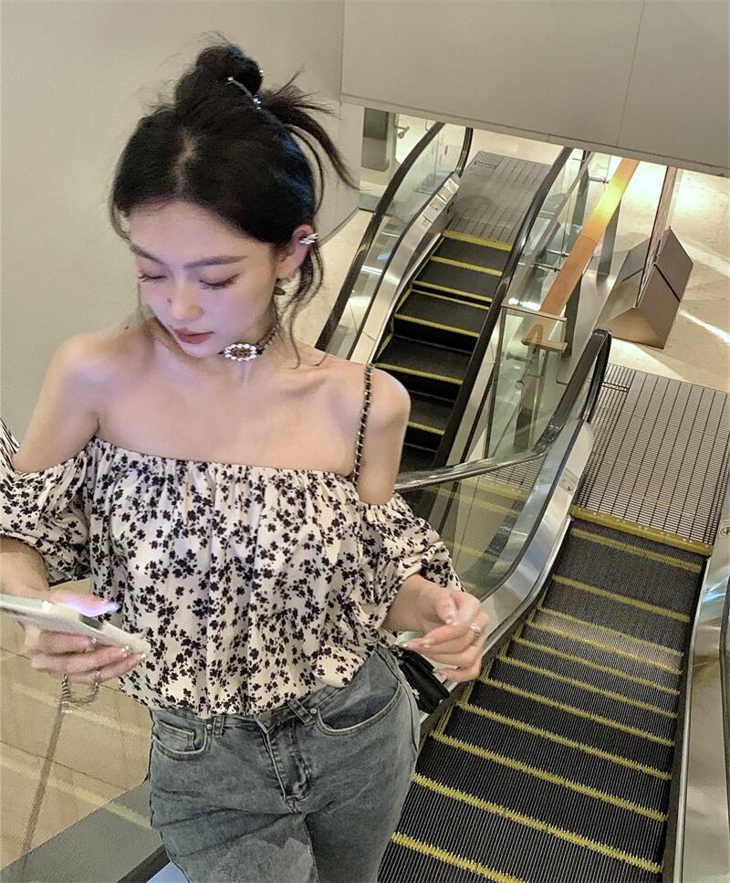 French retro one-shoulder floral shirt women's summer 2022 new design temperament puff sleeve short top ショート レトロ サマー 夏物 花柄 0921967541712608