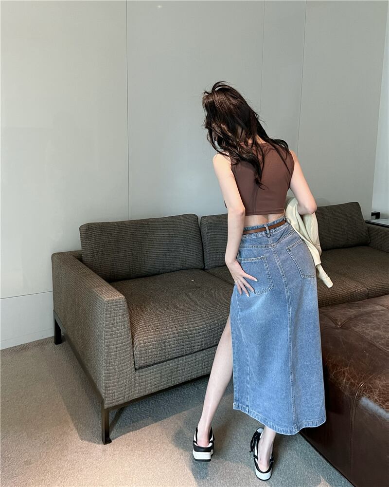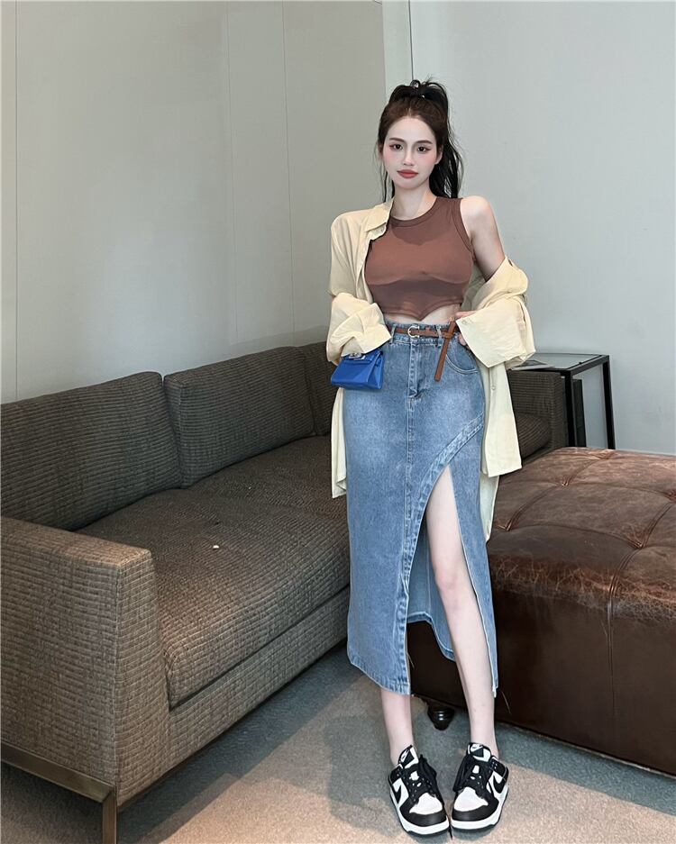 Retro split denim skirt women's summer 2022 new all-match high-waisted slim mid-length hip skirt レトロ サマー 夏物 スカート スリム 0921973330808394