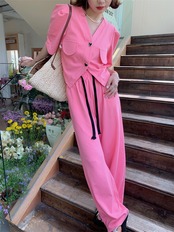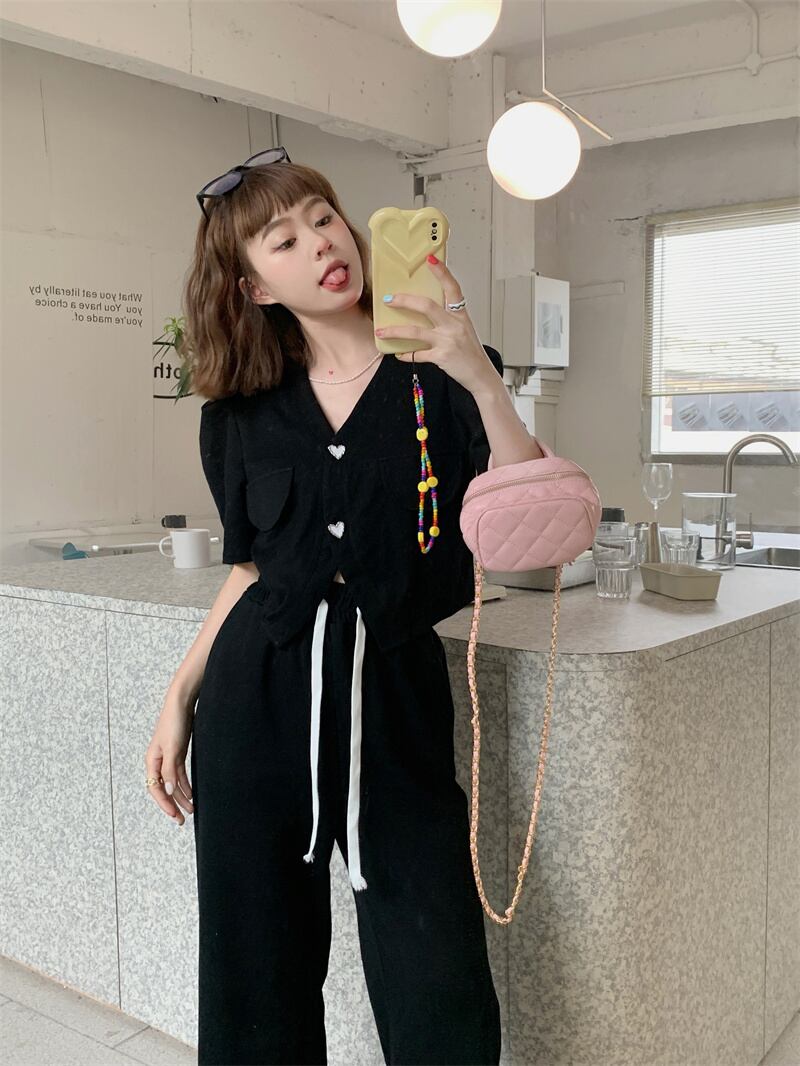 Black fashion suit women's summer 2022 new style love button short-sleeved top casual pants two-piece set ブラック カジュアル サマー 夏物 0921977866640773