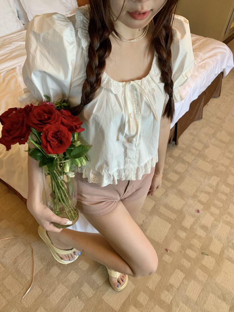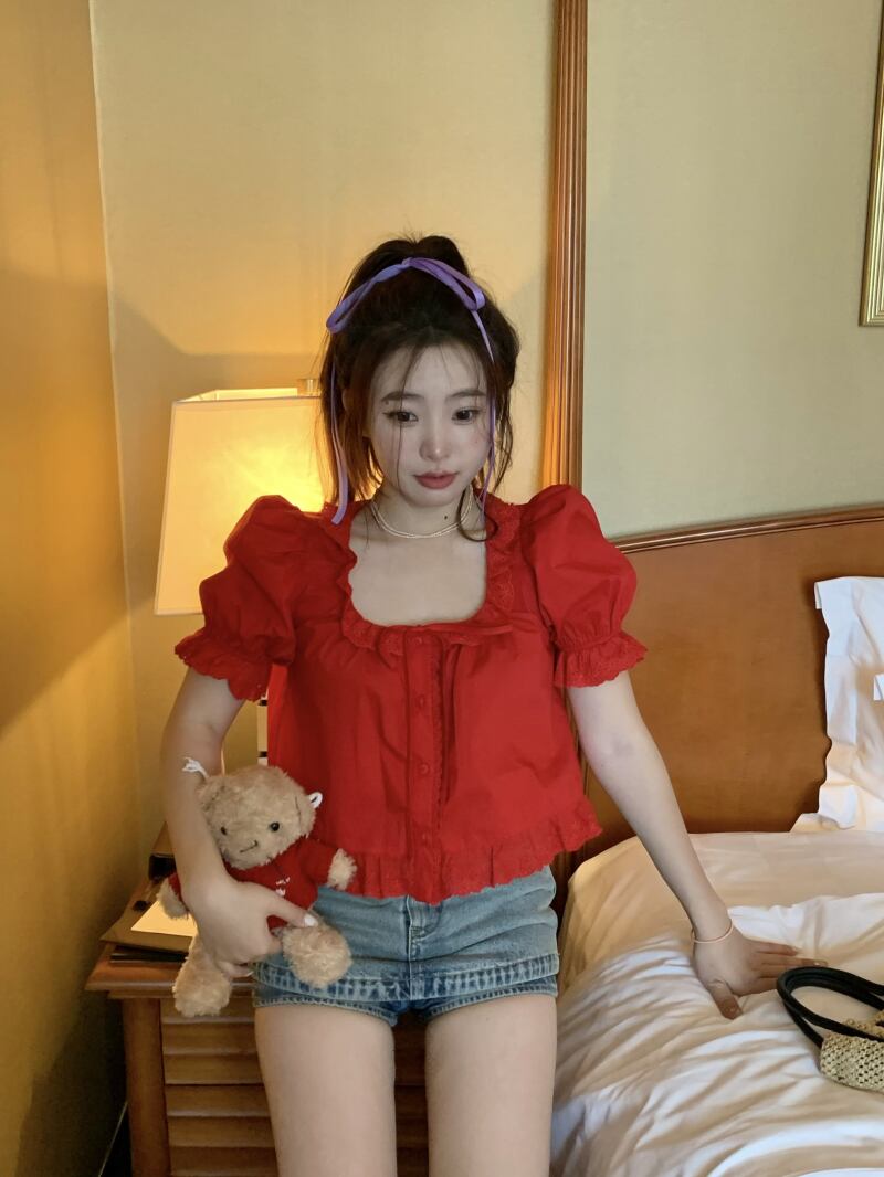 French red puff sleeve shirt women's summer 2022 new age-reducing fungus edge square collar loose short top trendy ショート レッド サマー 夏物 スクウェア 0921946634190811