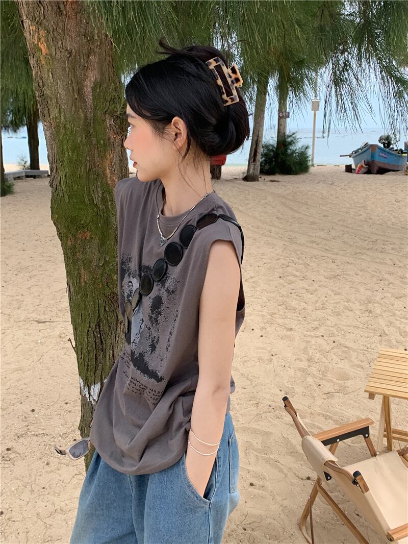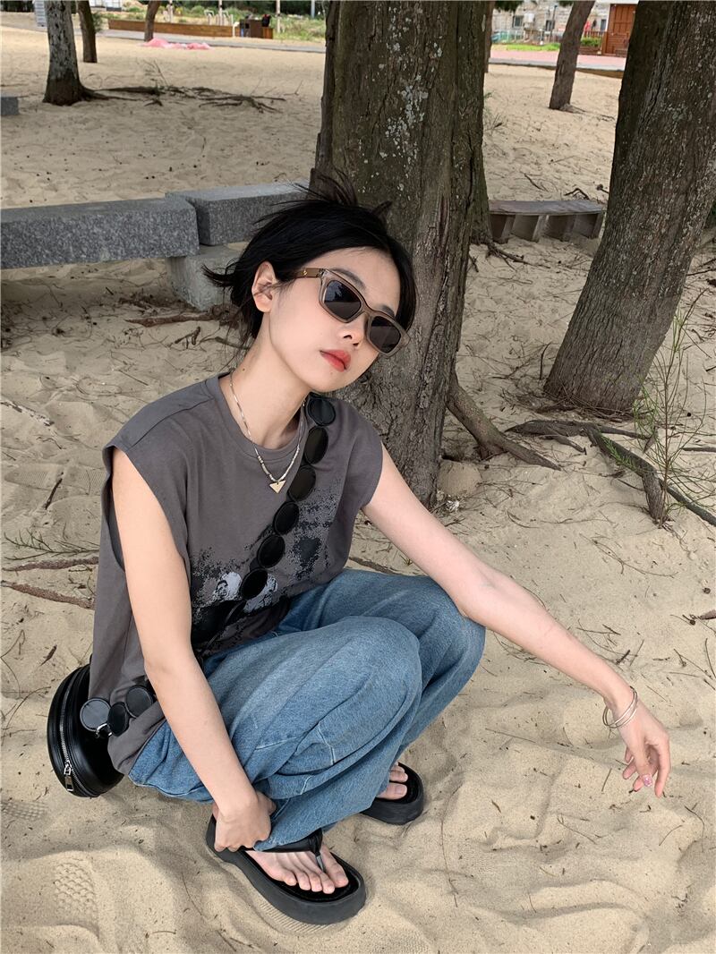 American fashion print sleeveless T-shirt women's summer 2022 new design sense version all-match loose top サマー 夏物 ノースリーブ Tシャツ 0921941618844423